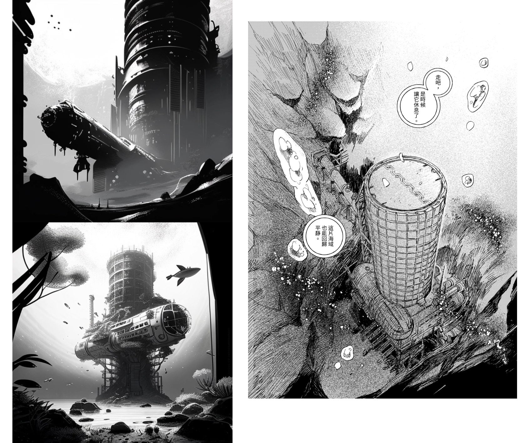 如此⼀來,或許創作時就能將更多⼼思投入在想表達的內容與細節琢磨上,這也是我使⽤AI 輔助作畫的初衷。