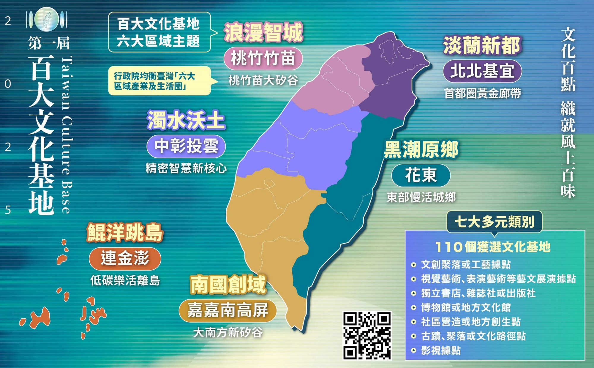 110個文化基地涵括文創聚落與工藝、藝文展演、獨立書店、地方文化館、社區營造、古蹟、影視等7大多元類別,同時遍布全國各地。文化部考量所處地理環境、生態及文化歷史等面向,設定區域主題名稱為北北基宜的「淡蘭新都」、桃竹竹苗「浪漫智城」、中彰投雲「濁水沃土」、嘉嘉南高屏「南國創域」、花東「黑潮原鄉」及連金澎「鯤洋跳島」,期待透過文化路徑、河流等串連臺灣各地不同的地理、生態,同時看見臺灣的文化多樣性及旺盛生命力。