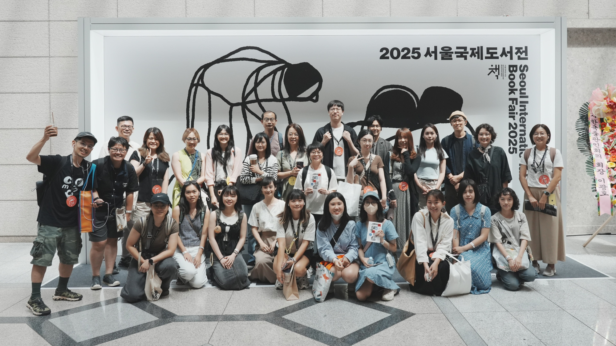 同一天的時間,陳雨汝在首爾書展現場為臺灣讀者導覽說明,與會者大合照(攝影:廖建華,逗點提供)