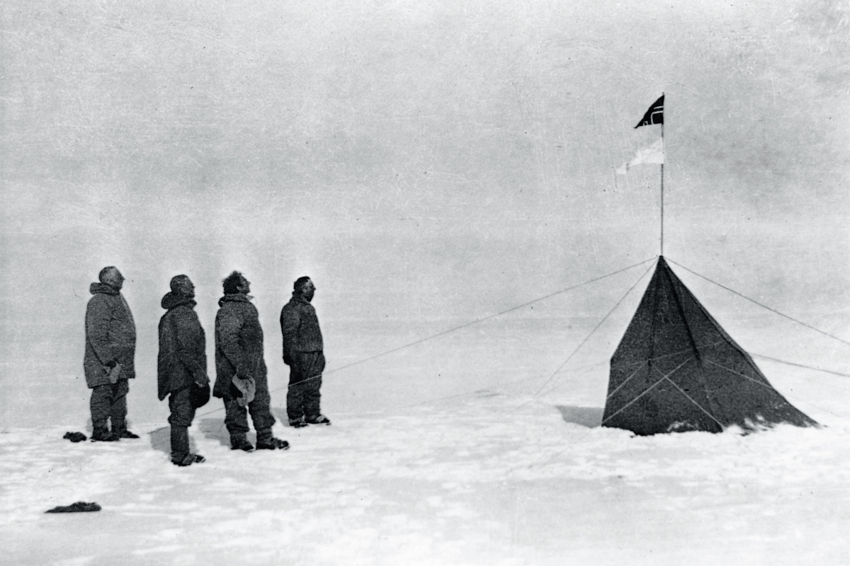 1911年阿蒙森和其隊員看著在南極的挪威旗幟。(圖源:維基 )