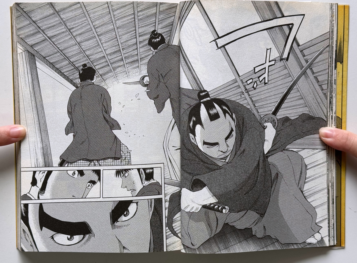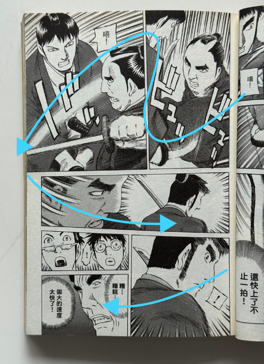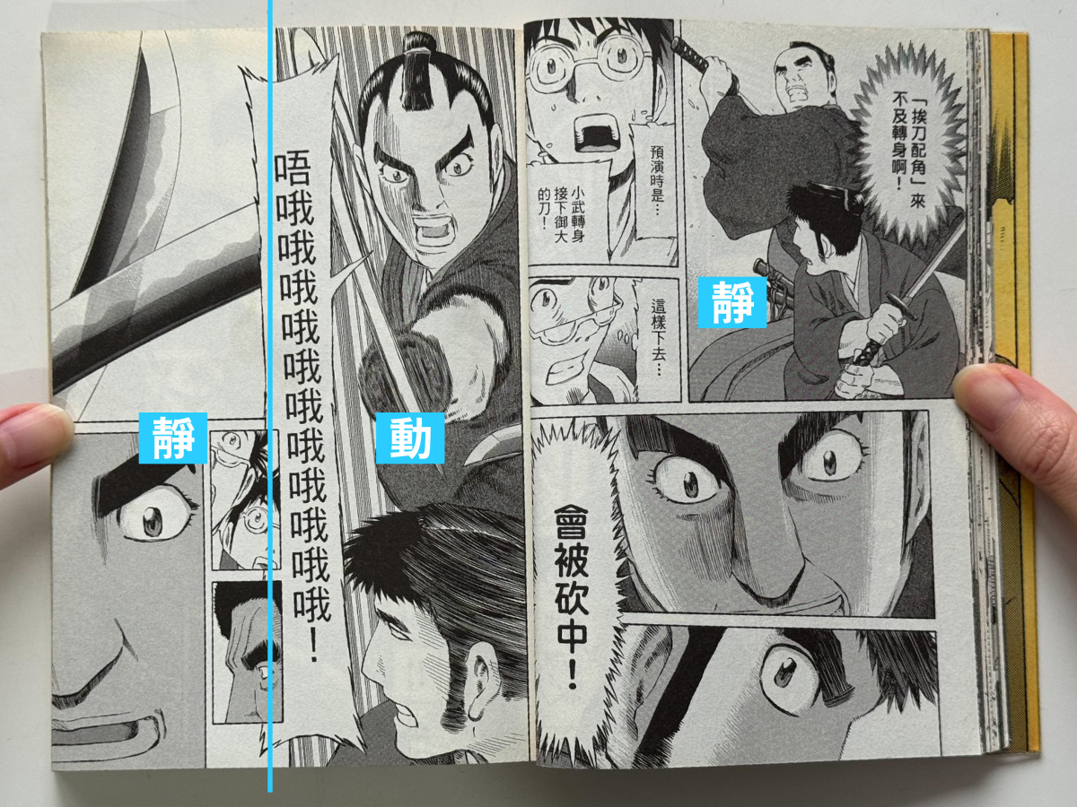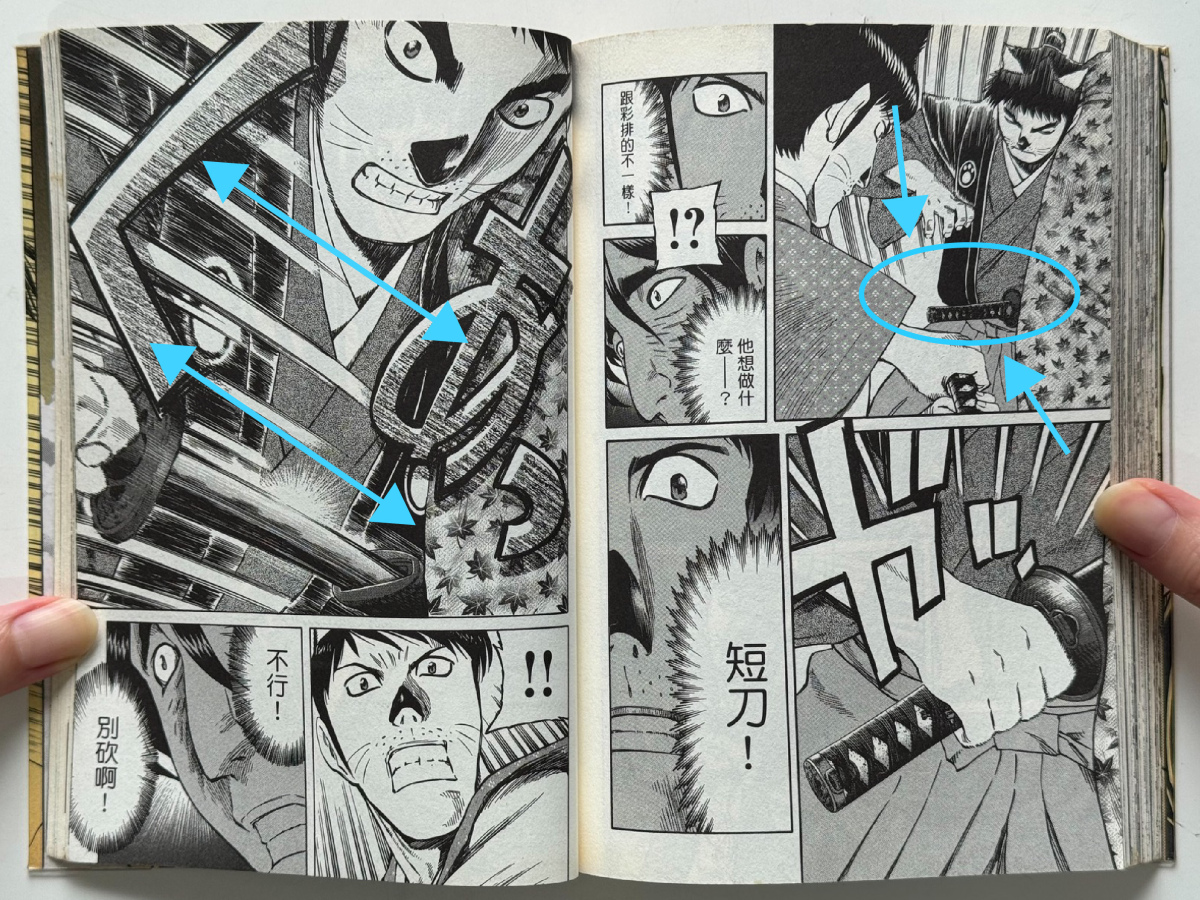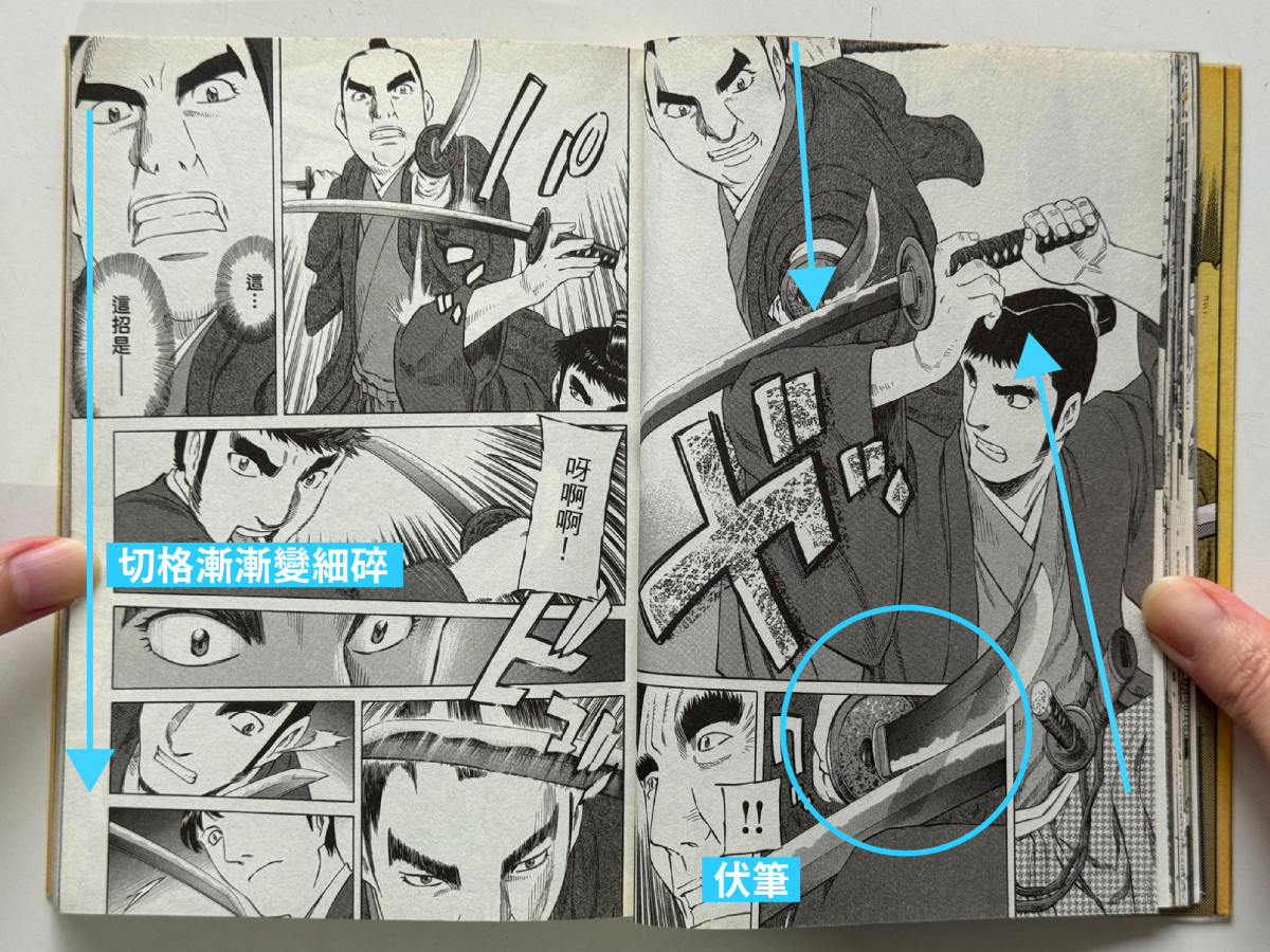 第34頁,卻打住了歌藏和武晴的對峙,在止息間塞入眾人心聲與追視。第35頁,直切成右動左靜 兩半,右半歌藏開劈、武晴狀似閃避不及,一轉到左上角,赫然是刀鋒相交前的停格,左下角則掃過眾人的凝視。一翻面,以大格刻畫武晴背後接刀,下方狹長地以破格特寫兩刃交鋒,旁搭一臉驚詫的武術指導,現露貓膩。在魄力壓頂的大格下橫亙這兩小格,不僅見縫插針地埋伏筆,更延存了電光火石的張力。