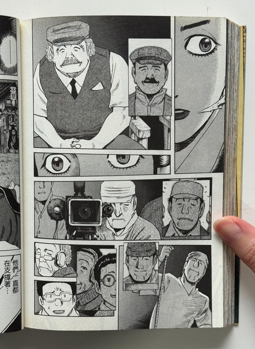 第174頁切作無聲的11格,眼眸流轉間,穿插幕後人員的今昔對比,眾人的舊影也擷自第164頁,多年的堅守因再三顯影而益發深刻。如此高密度的無聲切格,將掃視與萬念擰於轉瞬之間,是本作中我最鍾愛的一頁。