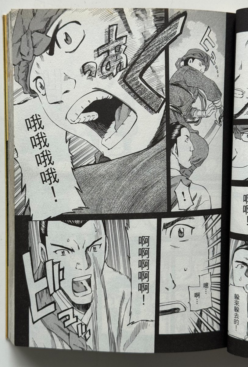 第4集,源八代替受傷的中國臨演,對戲囂張的日本演員。源八先矯健跑位捉弄對方,第61頁,突然配上密集的速度線和蹦彈的狀聲詞,大格特寫源八吶喊、日本演員慌亂揮刀,格與格間眼看要爆出花火,一翻頁,卻是日本演員呆視著鬆軟趴地的源八,以柔克剛令氛圍瞬間輕盈。