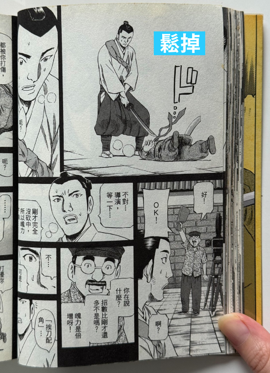 其一,為第2集英雄救美的拍攝。第178頁右上角第1格,透過演員奧村揮刀的肩,襯出將拔出腰刀的武晴,刀在畫格下半,塞於奧村揮砍的手和武晴下探的手之間,兩手迅猛拉近,佐以背景下墜的速度弧線,刀成了被急遽壓迫空間中的焦點。左半部作者穿插人物心聲,靜止的面容皆壓上深色網點,營造出抽離高速現實的真空。