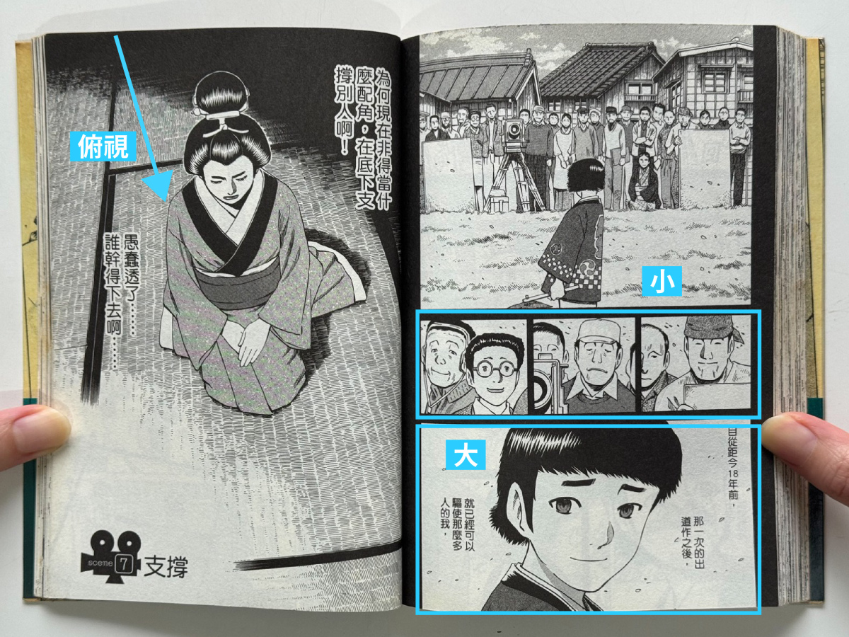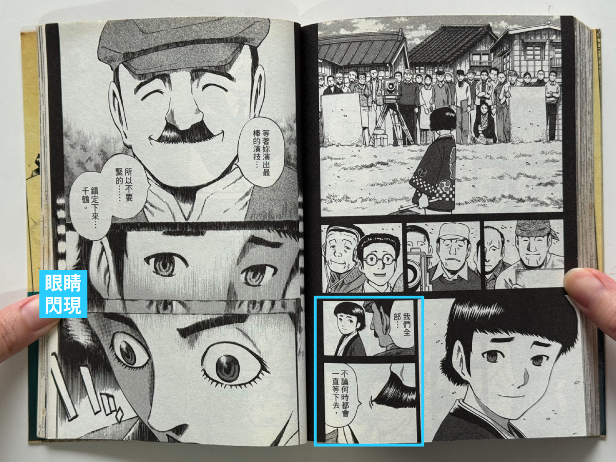 尤以第6回尾聲到第7回完結特別動人,第6回原本死灰的千鶴突然情感噴湧,在眾人的驚詫中懸念收尾。第7回開頭也無解釋,反倒先回溯18年前拍攝〈山之祭典〉時,童星千鶴回眸看著在背後支援的眾人,第164頁的分鏡,於中間滑過一排幕後人員的面容,底格是小千鶴的特寫,以平視綻放略感壓力卻盈溢星光的笑容。下一頁拉回現時,用整面俯視飾演喪子之母、淪為配角的千鶴,被俯角壓得身形佝僂、眉目低垂,佐以背景光影及啐罵獨白,整頁抑著憤懣。