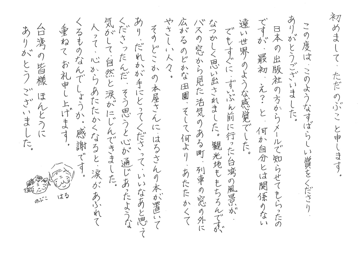 當日本出版社透過電子郵件通知我得獎消息時,我一開始心想:「咦?」,覺得這彷彿是個距離我很遙遠世界的事情。但很快地,我想起來了很久以前曾到臺灣看到的風景。除了觀光景點外,還有從巴士車窗外看到熱鬧的街市、火車窗外廣闊的田園風光,最令我難忘的是溫暖且善良的人們。