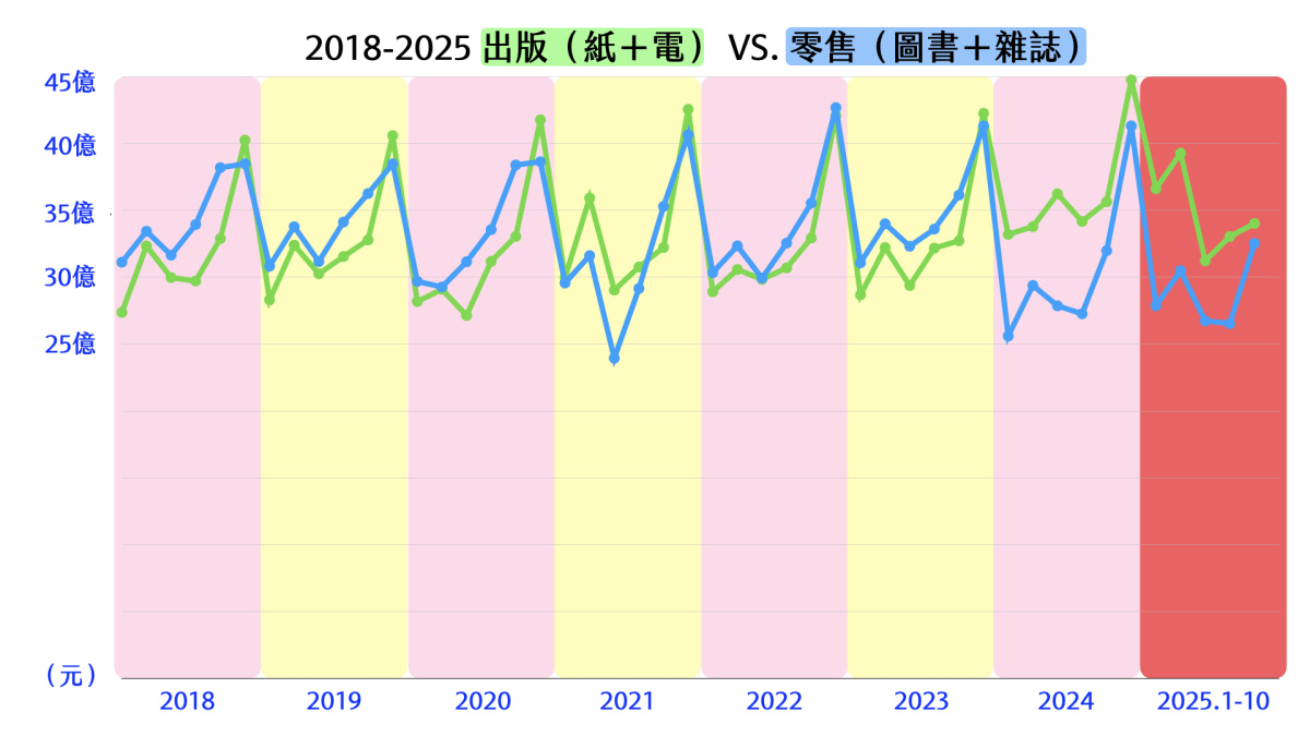 2018-2025 出版(紙+電) VS. 零售(圖書+雜誌)
