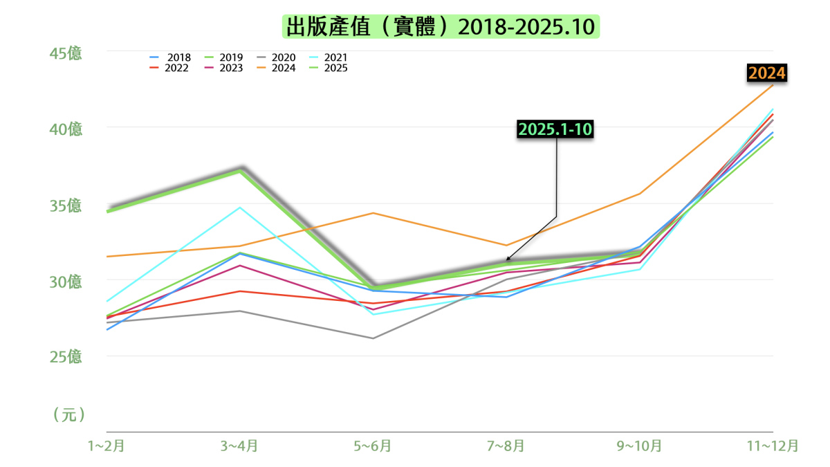 單就此統計資料,實體出版的發貨金額到今年上半年為止都較去年同期成長,原因不明,推測一部分與博客來書店、誠品台南店等大型書店的開店訂單,或是擴大施行的文化幣政策有關。5、6月起較去年同期衰退,但以此圖表觀之,其實與往年走勢相近,反而是2024年特別不同。