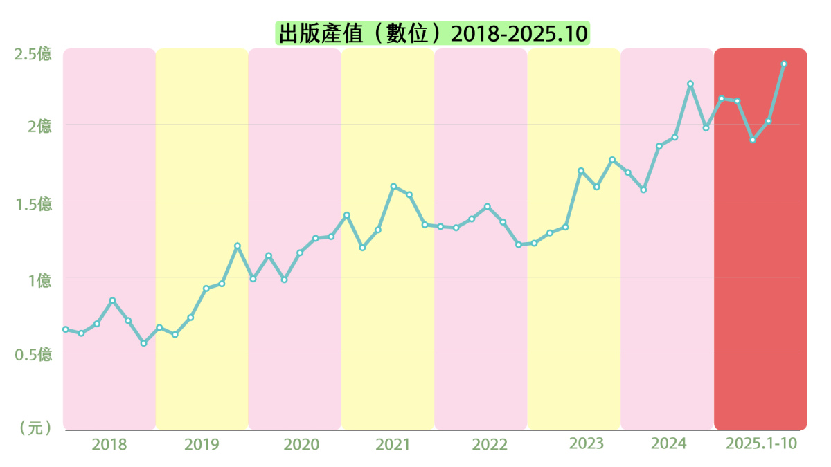 先從財政部資料庫統計數據開始,在出版端的部分,2024年:實體出版(5813-11)206億、數位出版(5813-12)11.2億,合計217億;2025年至10月為止:實體出版163.5億、數位出版10.6億,合計174億。