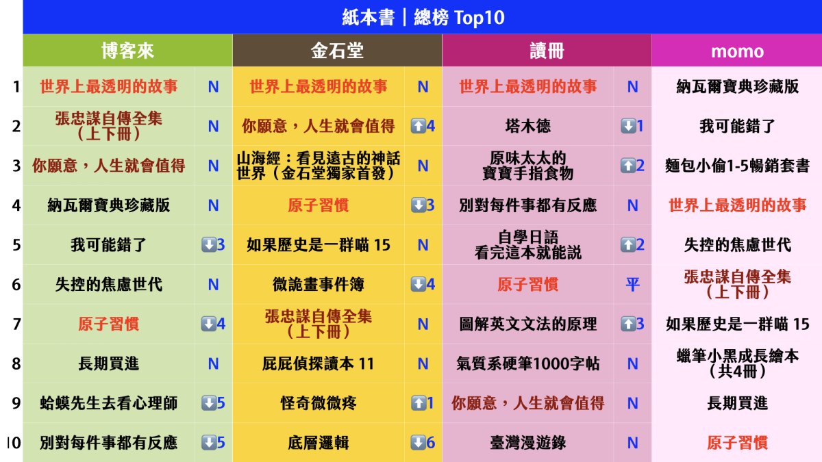 紙本書|新書榜 Top10(圖表說明:1.後方數字為該書在總榜之名次;2.金石堂總榜僅公布至前20名)