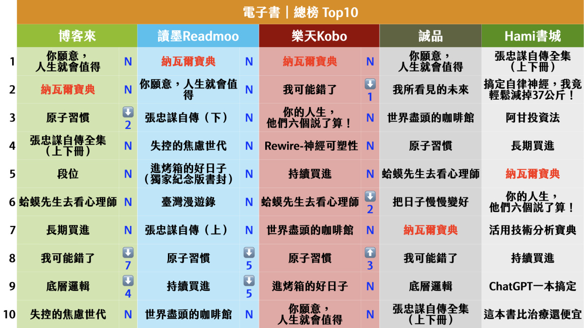 在這五家經營模式各異的電子書平台上,唯一通吃的品項是《納瓦爾寶典》,《張忠謀自傳》、《你願意,人生就會值得》、《原子習慣》則居次。《原子習慣》自2019年出版至今仍在榜單占有一席之地,紙電合計超過75萬冊(年初統計),亦是台灣第一本銷量超過10萬冊的電子書。