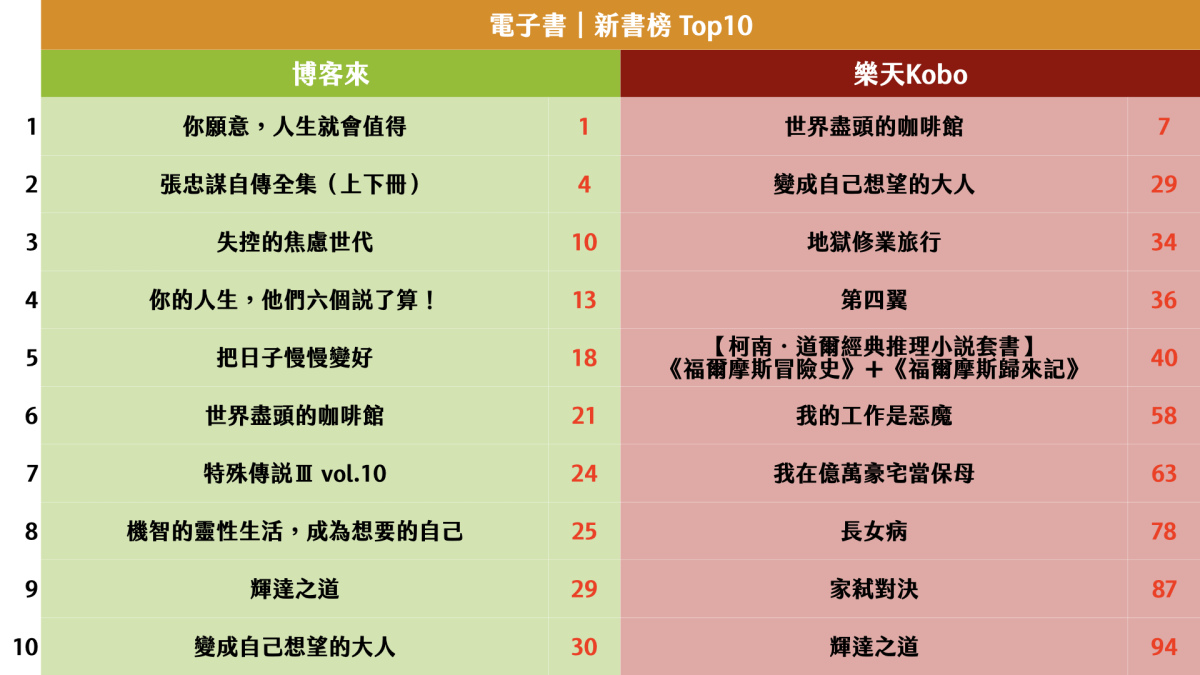 電子書|分類榜|榜首(圖表說明:分類榜圖表說明:1.各通路分類定義並非完全一致,僅參考品項及銷售落點;2.非共通分類未列入,因此加總並非100名;3.後方數字為該書在總榜之名次;「-」表示在總榜百大外)