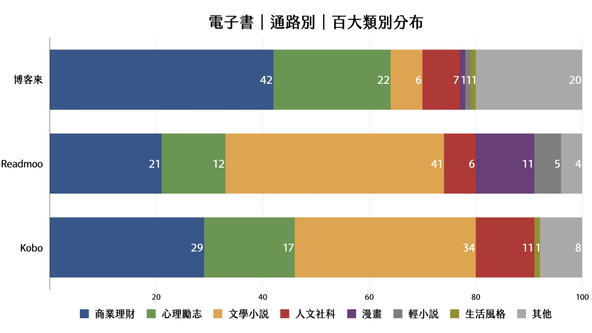 電子書今年除了誠品加入戰局,本次也將2013年成立的Hami書城公布的百大清單列入觀察,希望能呈現更完整的市場樣貌。Hami書城的百大書單中,商業理財是絕對強勢書種,自我成長和生活類實用書其次。與之最接近的是博客來,與紙本書不同,電子書百大中商業書超過4成,應與使用者的基數和閱讀習慣有關;誠品的電子書讀者與紙本書屬性接近,前十名以心靈療癒居多;讀墨和Kobo的閱讀板塊重疊度較高,文學小說占4成上下,加上輕小說、羅曼史後更逼近一半席次,是近年難得一見的趨勢。