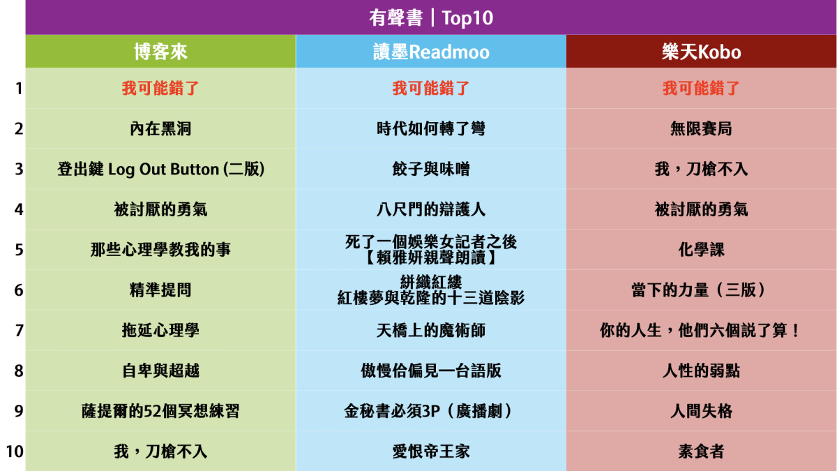 有聲書雖然仍是書市中很小的領域,今年也將三家通路的榜單彙整出來。博客來和Kobo都以心靈成長類為主,讀墨則同樣是文學小說的天下。