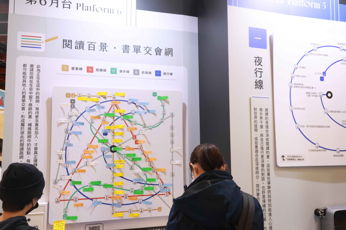 走進「閱讀轉運站」,首先映入眼簾的是一張巨大的「路網圖」——不同顏色的線路疊合在一起,像把城市裡的交通脈絡搬進展場,每個月台各自有一個性格鮮明的選書主題;每個月台陳列約20本書,由10間獨立書店共同完成:每間書店在一條路線上推薦兩本書,讓整座轉運站像一張由書店彼此接力織成的閱讀地圖。