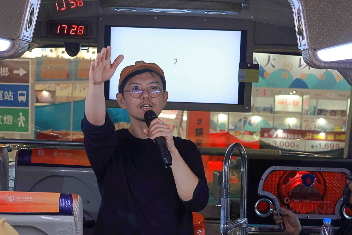 獨立出版聯盟理事長陳夏民,遊覽車也可以當作演講的空間