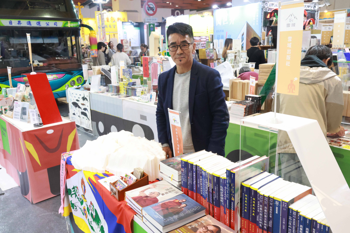 西藏台灣人權連線祕書長札西慈仁介紹,攤位由兩個單位並列組成:一是西藏台灣人權連線,另一是雪域出版社,兩邊都聚焦西藏。札西慈仁提到,出版社的書籍多圍繞西藏處境、宗教與文化,也包含與法王相關的內容,「若想用中文系統性了解西藏,雪域是很重要的出版社。」