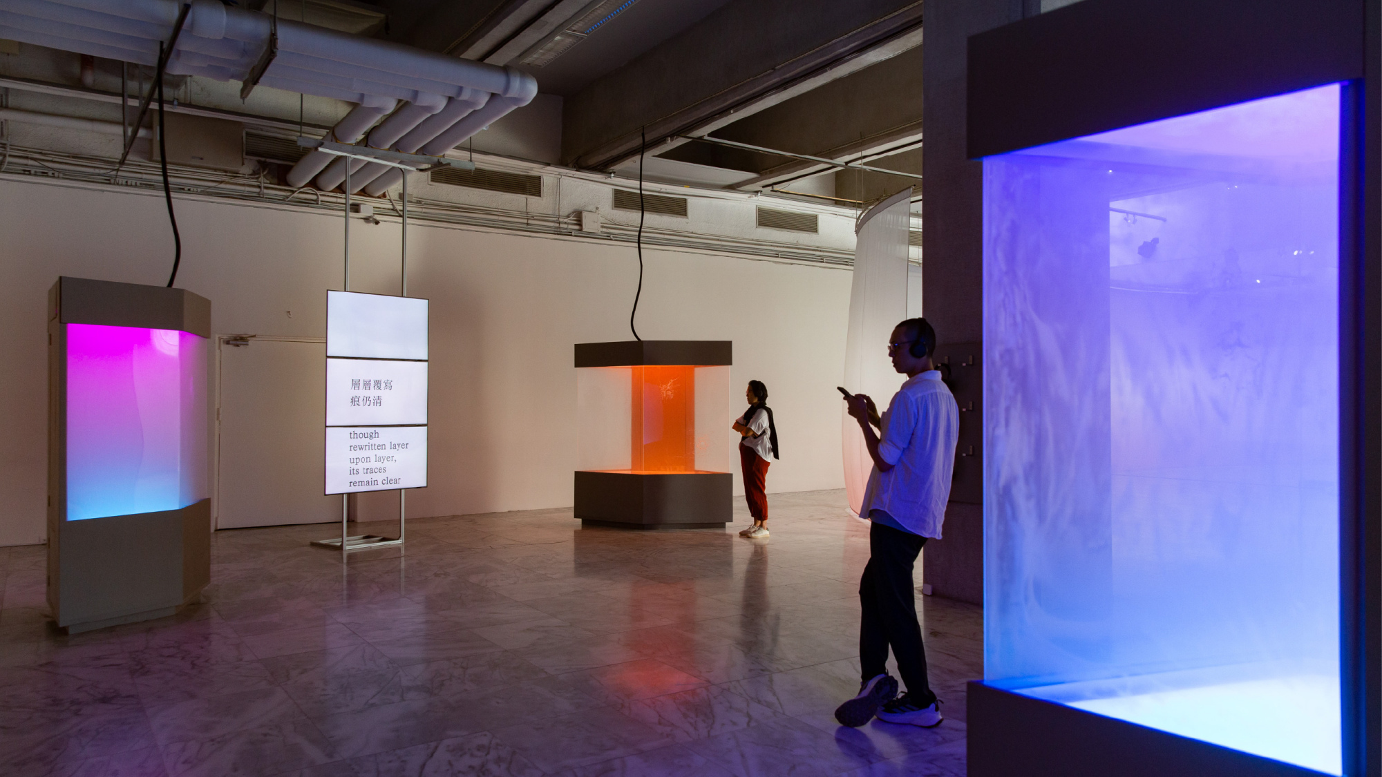 致穎,《再鑄》,2025,同步音訊、三組受損展示櫃、LED 燈具與煙霧機、三幅附框素描,每幅 42 × 42 公分,尺寸依空間而定,藝術家版權所有,由 2025 台北雙年展委託製作。(臺北市立美術館提供)
