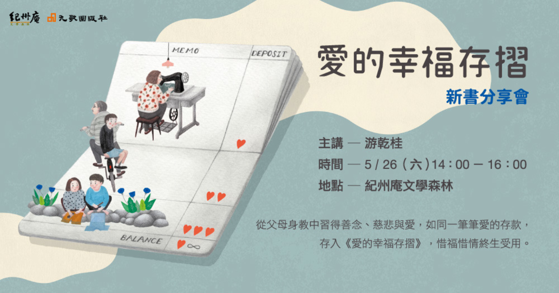 【游乾桂《愛的幸福存摺》新書分享會】 時間:5/26(六)14:00-16:00 地點:紀州庵文學森林(台北市同安街107號2樓) 報名連結:https://tinyurl.com/yaux9oqx
