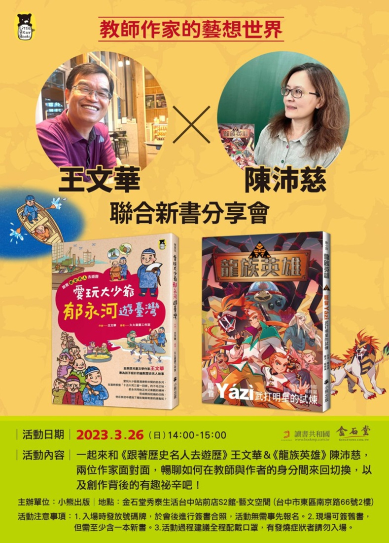 「教學與創作間的斜槓人生」一起來和《跟著歷史名人去遊歷》王文華&《龍族英雄》陳沛慈,兩位作家面對面,暢聊如何在教師與作者的身分間來回切換,以及創作背後的有趣祕辛吧!活動時間:3/26(日)14:00-15:00活動地點:金石堂臺中門市,臺中市東區南京路66號2樓(秀泰S2館)會後簽書活動注意事項:1.入場時發放號碼牌,於會後進行簽書合照,活動無需事先報名。2.現場可簽舊書,但需至少含一本新書。3.活動過程建議全程配戴口罩,有發燒症狀者請勿入場。