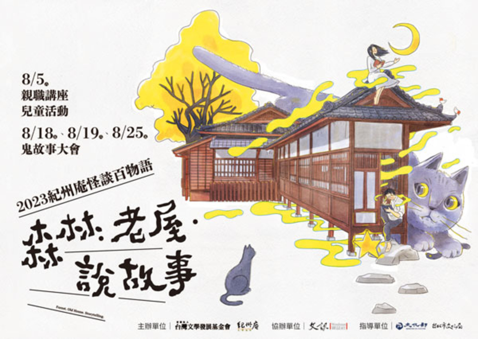 紀州庵全新企劃「森林.老屋.說故事」,邀請大家在鬼月前後來到紀州庵,和我們一起「假鬼假怪」!這系列活動共分三部分:【假鬼假怪小遊藝(兒童場)】為三年級以上小朋友設計,由插畫家角斯帶領大家親手製作獨一無二的鬼怪面具,再跟著國語實小名師鄒敦怜老師,為自己設計的鬼怪寫一篇獨一無二的鬼故事。(限額30名)【怡神移鬼親職講座(成人場)】:為家長和所有對親子議題及繪本有興趣的朋友們規劃,由作家番紅花及繪本收藏家蘇懿禎(FB〈火星童書地圖〉粉專主筆)開講。邀請大家一起「移」走親子關係中的「鬼」,並「怡」然自得地欣賞世界各國有趣的鬼怪繪本。【鬼故事大會】:週五、六的晚上,邀請祁立峰、馬紹阿紀和張正來到紀州庵古蹟,和大家分享不同族群的鬼故事。精選的鬼故事都是普遍級的唷!適合全家大小一起來,共度刺激又有趣的夏夜。(限額60名)炎炎夏日熱得受不了了嗎?紀州庵怪談百物語,邀請大家消暑一嚇!