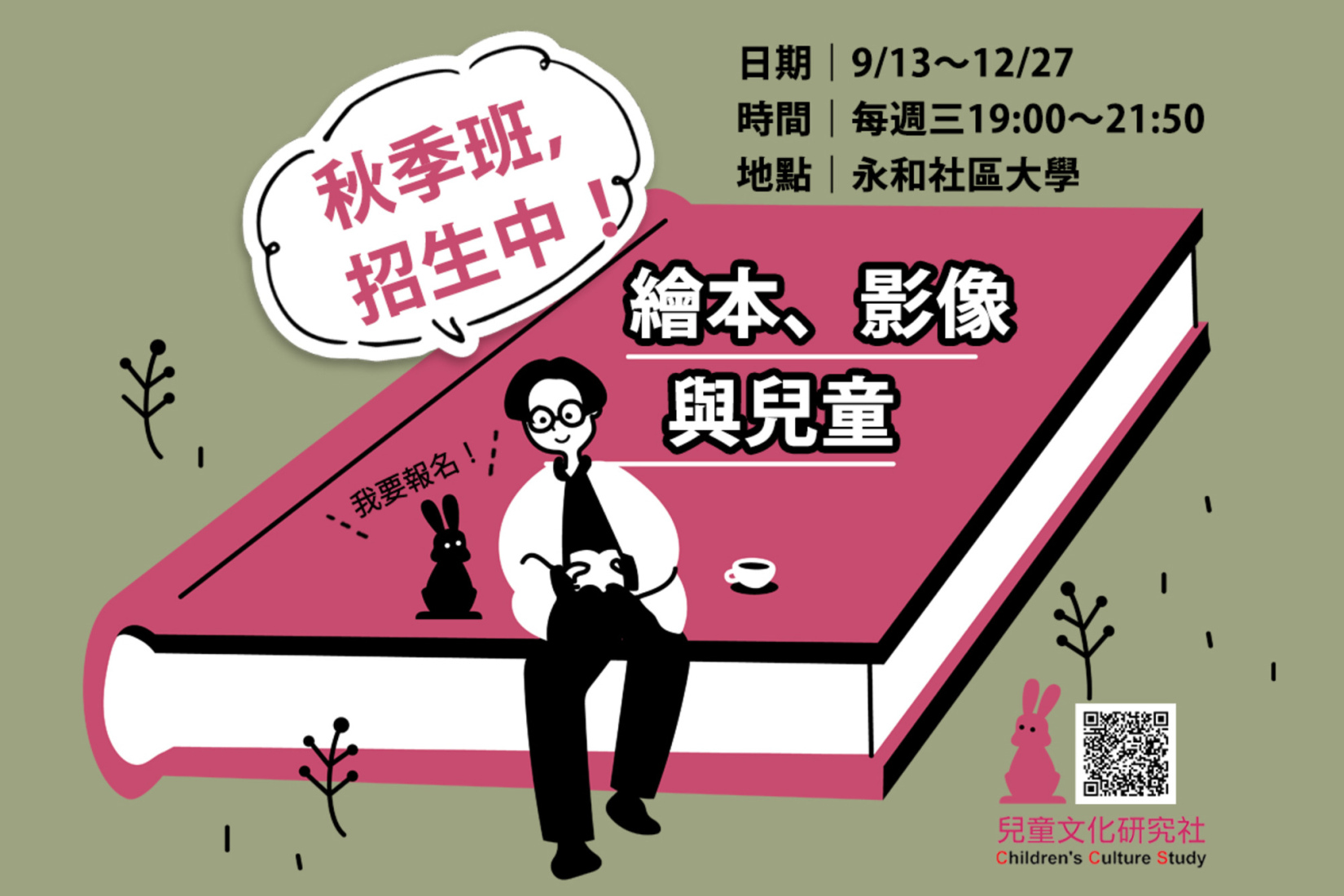 「繪本、影像與兒童」這門課程將以「兒童」為關鍵字,從繪本賞析、共讀書籍與電影出發,帶你一起了解兒童的特質,探索繪本的力量!上完一學期的課,你會學到......・認識60本英、美、歐、日、台等世界各國的好繪本!・深入賞析繪本大師的人生與他創作的精采繪本!・聽到台灣繪本作家親自分享創作歷程與作品!・共讀兒童文學經典與電影!・朗讀與演奏繪本的技巧!・了解兒童權利之父——柯札克先生的故事~・探索「兒童的特質」&賞析兒童人權議題繪本!・還有......還有更多,來上課才會知道的喔!適合對象:・對繪本有興趣的大人・繪本愛好者・繪本創作者・想了解親子共讀的家長・關心兒童的大人・想要喚醒住在心裡的孩子的大人詳細課程內容,請詳報名連結>> https://pse.is/5768jr上課日期|9/13~12/27 上課時間|每週三 19:00~21:50上課地點|永和社區大學(新北市永和區永利路71號)【講師簡介】「兒童文化研究社」是由一群關心兒童的大人所組成,長期以「兒童」為關鍵字,研究兒童文化與相關議題,推廣繪本、親子共讀、兒童權利與探索兒童觀,創造「讓兒童發聲」的機會與社會實踐,並開辦0~3歲yoyo親子讀書會。「兒童文化研究社」講師群包括: 資深兒童文學工作者林真美、小大聯盟召集人林以琳、兒童文化研究社社長程詩婷、前兒童文化研究社社長、童書編輯熊君君等共同授課。