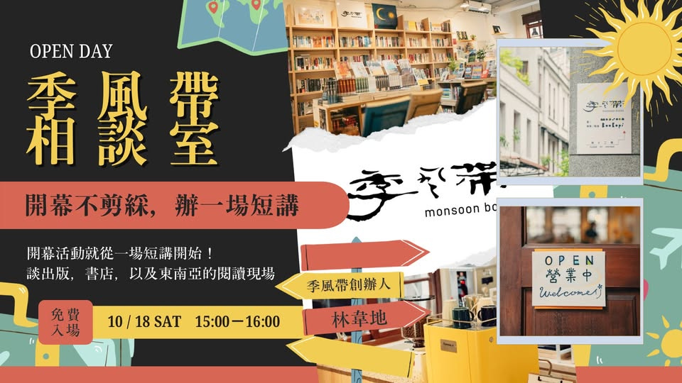 季風帶相談室—開幕不剪綵,辦一場短講開幕活動,就從一場相談開始。創辦人林韋地將帶來一場短講,談出版、書店,從書的誕生到書店的經營,談閱讀與文化的連結,以及東南亞的閱讀現場。時間|10/18 (六)15:00–16:30地點|季風帶書店免費入場