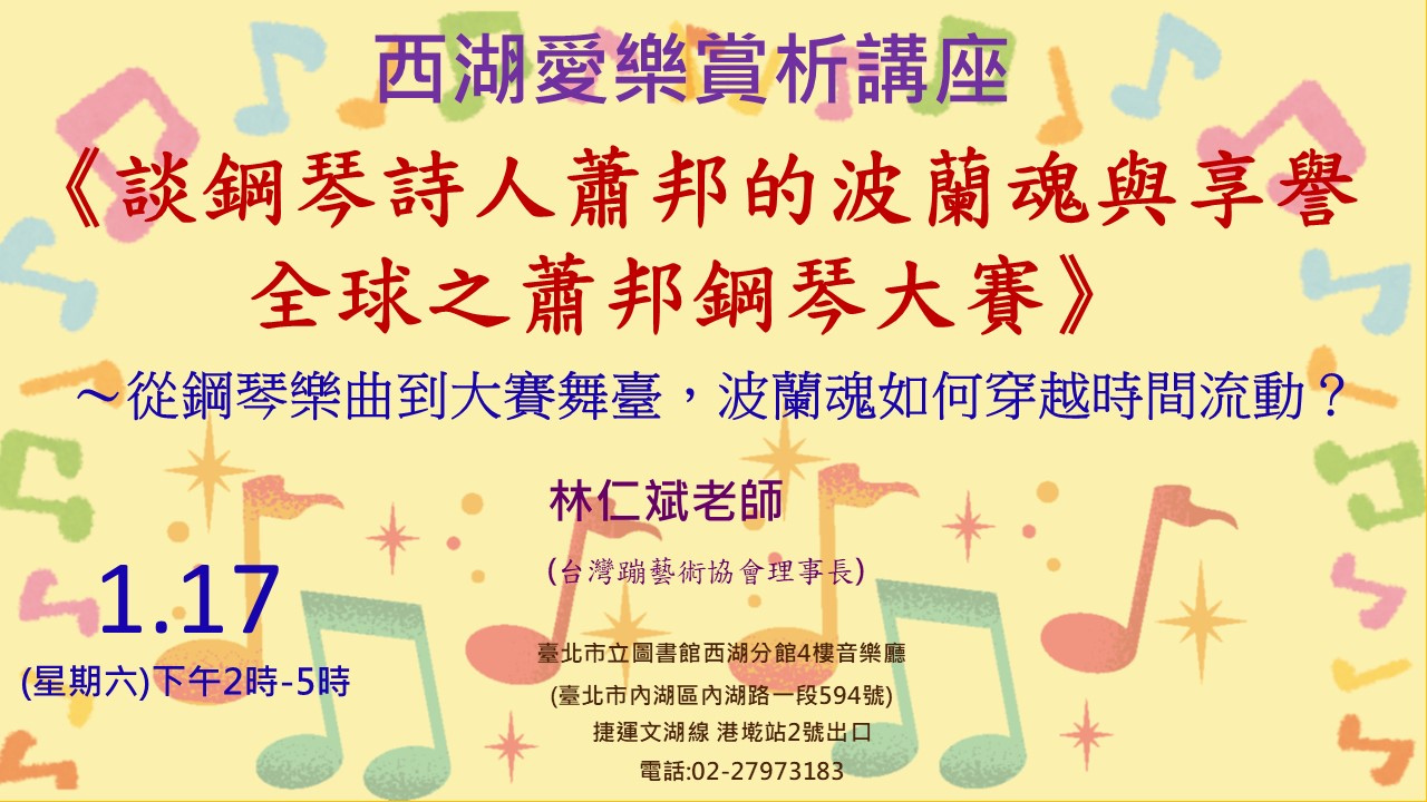 115/1/17西湖愛樂賞析講座:《談鋼琴詩人蕭邦的波蘭魂與享譽全球之蕭邦鋼琴大賽》〜從鋼琴樂曲到大賽舞臺,波蘭魂如何穿越時間流動?蕭邦,十九世紀的鋼琴詩人,用音符寫下對波蘭的愛與永恆的思念。他的馬厝卡舞曲,跳動著故鄉的脈動,他的夜曲,在巴黎沙龍中低語著異鄉孤影;而波蘭舞曲,則帶著尊嚴與驕傲,獻上音樂家的無聲抵抗與對故鄉的祝禱。近兩百年後,鋼琴詩人的琴聲並未沉寂,而更穿越時代,在今日的音樂廳與國際大賽中迴響著:2025年,來自世界各地的年輕琴者齊聚波蘭華沙,試圖用雙手觸碰那段已然傳奇的語言。林仁斌老師更是蕭邦鋼琴大賽近百年歷史中,首位獲邀完整欣賞並報導之臺灣音樂家媒體。本場音樂講座將帶您從蕭邦生平與創作出發,深入探討他如何將波蘭靈魂注入鋼琴語彙,從蕭邦之音樂到國際大賽的文化意義~歡迎愛樂的朋友們相約到場參加。※活動時間:1月17日(週六)下午2時至5時※活動地點:臺北市立圖書館西湖分館4樓音樂廳(臺北市內湖區內湖路一段594號)※活動講師:林仁斌老師(台灣蹦藝術協會理事長)※洽詢電話:02-27973183※備註:不需事先報名,下午1時30分開放入場。全程參與者提供公務人員終身學習認證時數3小時及閱讀存摺點數5點(公務人員如需認證者,請先至「公務人員終身學習網」線上報名。)