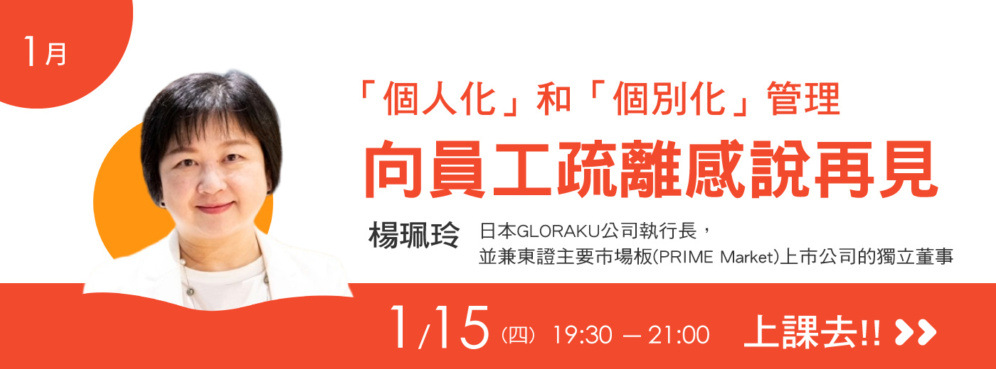 每月一堂90分鐘真人線上課,邀請資深領導人與顧問分享經驗,搭配專屬網站看回放,以及閱讀影音文章,協助提升專業與領導能力。歡迎參加「我們學堂」,用最沒有壓力的方式一起成長。我們學堂1月主題「個人化」和「個別化」管理 向員工疏離感說再見1月導師楊珮玲日本GLORAKU公司執行長2026年01月【我們學堂】「個人化」和「個別化」管理 向員工疏離感說再見重量級導師:日本GLORAKU公司執行長 楊珮玲課程時間:2026.01.15(四) 19:30-21:00 Zoom會議室【我們學堂】標竿企業領導人都在參加的線上課程 「我們學堂」是EMBA雜誌為新一代主管推出的學習計畫。每月一堂90分鐘真人線上課,邀請傑出資深領導人分享經驗,搭配影片回放,網站影音、文章閱讀,解答你的困惑。費用:1年12個主題特別優惠價 3600 元 (原價4800元)了解更多>>https://reademba.pse.is/4ujrekEMBA 雜誌讀者服務電話:02-2768-0105 轉 211、213信箱:service2@emba.com.tw