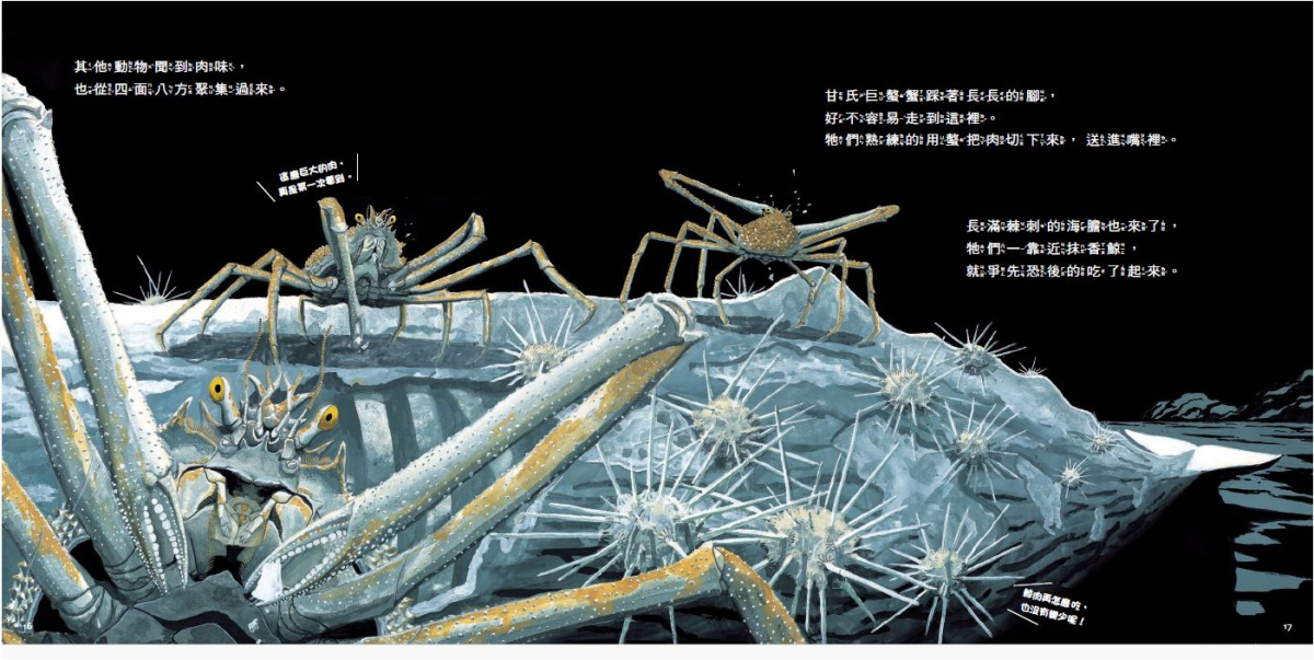 一隻抹香鯨靜靜沉落,牠的身體成了海底的綠洲,鯊魚、鰻魚、蟹、海膽、具足蟲接力分食,最後啃到連骨頭都不剩。這段以死亡為起點,卻孕育延續了百年生物的「鯨落」,終於震撼出現在繪本裡,龐大卻無聲,溫柔亦莊嚴,讓讀者可以得見。兼具科學寫實與抒情遼闊的畫面,讓人不禁安靜、凝視、敬畏。每一頁都有神聖力量包圍,每一幕都是不可思議的生命遇見。【內容簡介➤】