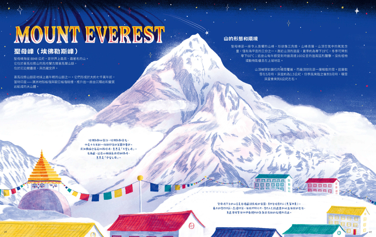 一本上至天候下至地質的精彩知識書,一本圖列攀登裝備的完備指南書,也是一本有血有淚的自然征服史。任何時候,只要翻開這本書,海拔瞬間突升,世界八大高峰:聖母峰、馬特洪峰、欽博拉索山、富士山、吉力馬札羅山、德納利山、查亞峰和文森山脈已在腳下,不可思議的壯麗景色360度盡現眼前。在充滿民俗風情的插圖與寫實考究的嚮導解說下,讀者們一路攻頂直上。每一個步伐,每一位人物,每一段故事,都像是親身遭遇過一樣。有冒險,有超越,頁頁真實,所以難忘。【內容簡介➤】