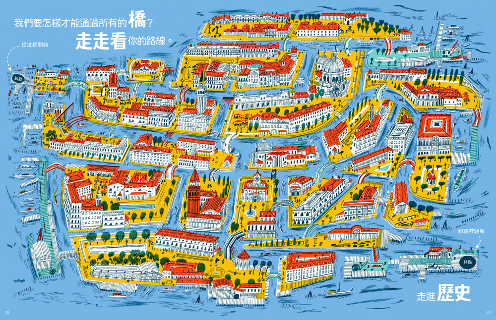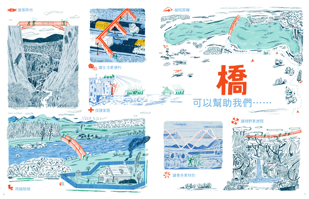 橋的優雅,橋的霸氣,都在書中展露無遺。不管是一棵剛傾倒的樹,或是舉世聞名的布魯克林大橋,都兼具力與美,穩穩扛住兩端的重量與風雨。橋該如何測量建造?橋有哪些故事傳說?這本書也通通說給你聽,吊橋拱橋斜張橋,琴橋牙橋奈何橋,串聯起有形或無形,通往不只一種想像與風景。謝謝強大的作者與繪者,用心蒐集了這麼多古典的、現代的、技術的、美學的、文化的、神祕的「橋梁」相關知識,靈活編排,大器呈現,不僅資料數據解說詳實,圖像更是充滿動感勁道,讓人忍不住愉悅跟隨,把地球上的所有橋梁都走過一遍也不覺累。【內容簡介➤】