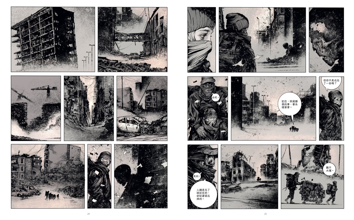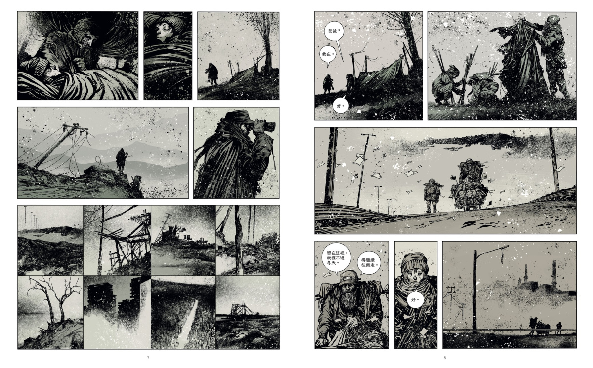 但結果卻出乎意料。不同於電影的強作解人,生硬賦予過度的戲劇張力,落入了類型的窠臼,破壞原作的韻味,圖像小說版《長路》,則努力依循著麥卡錫筆下原有的律動,張馳收放之間,成功傳遞出原著的精神風貌。