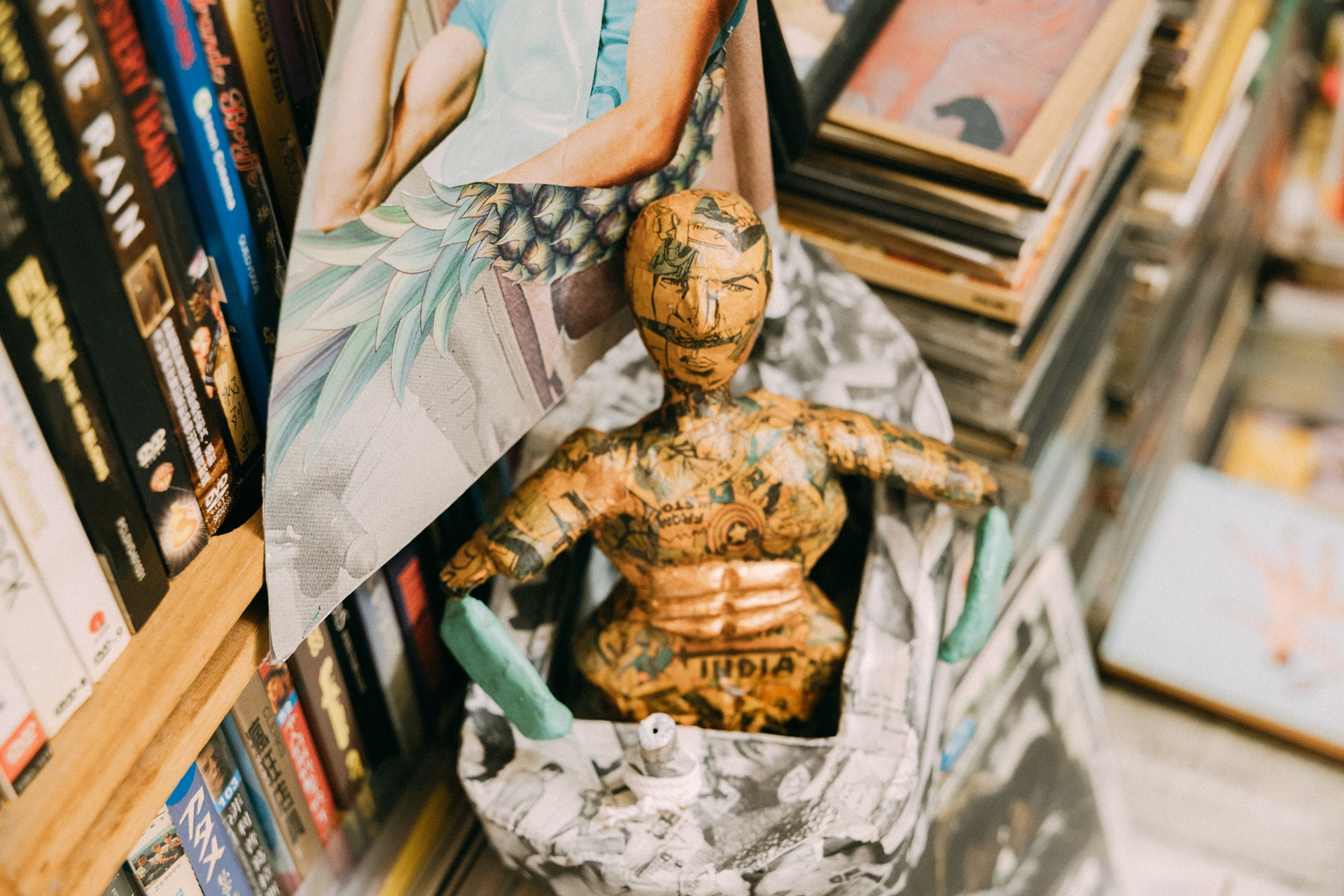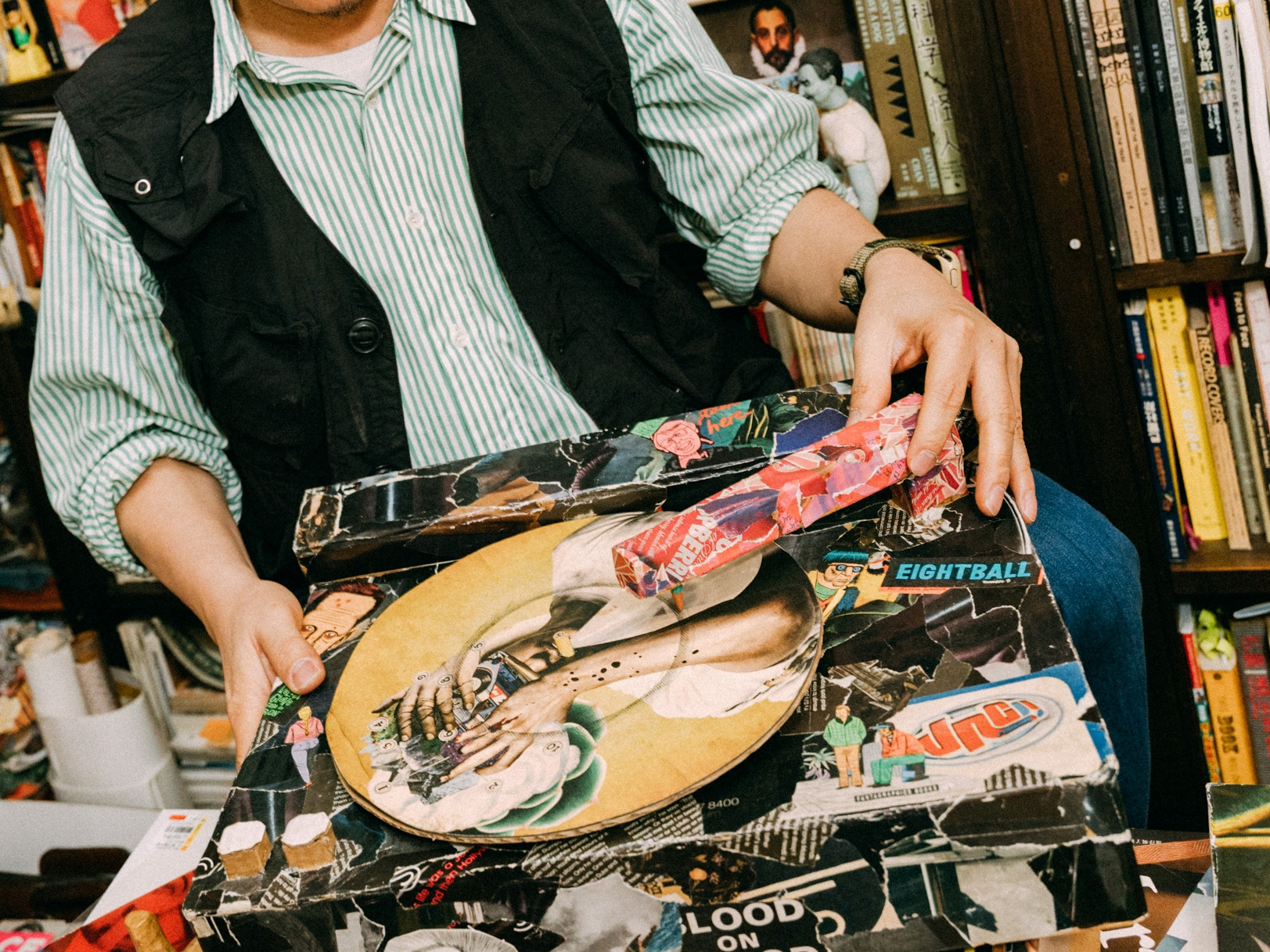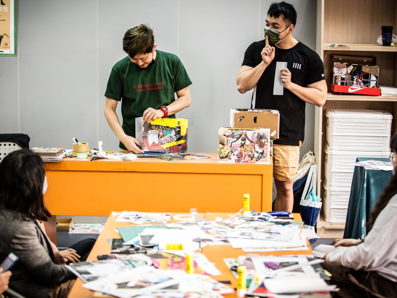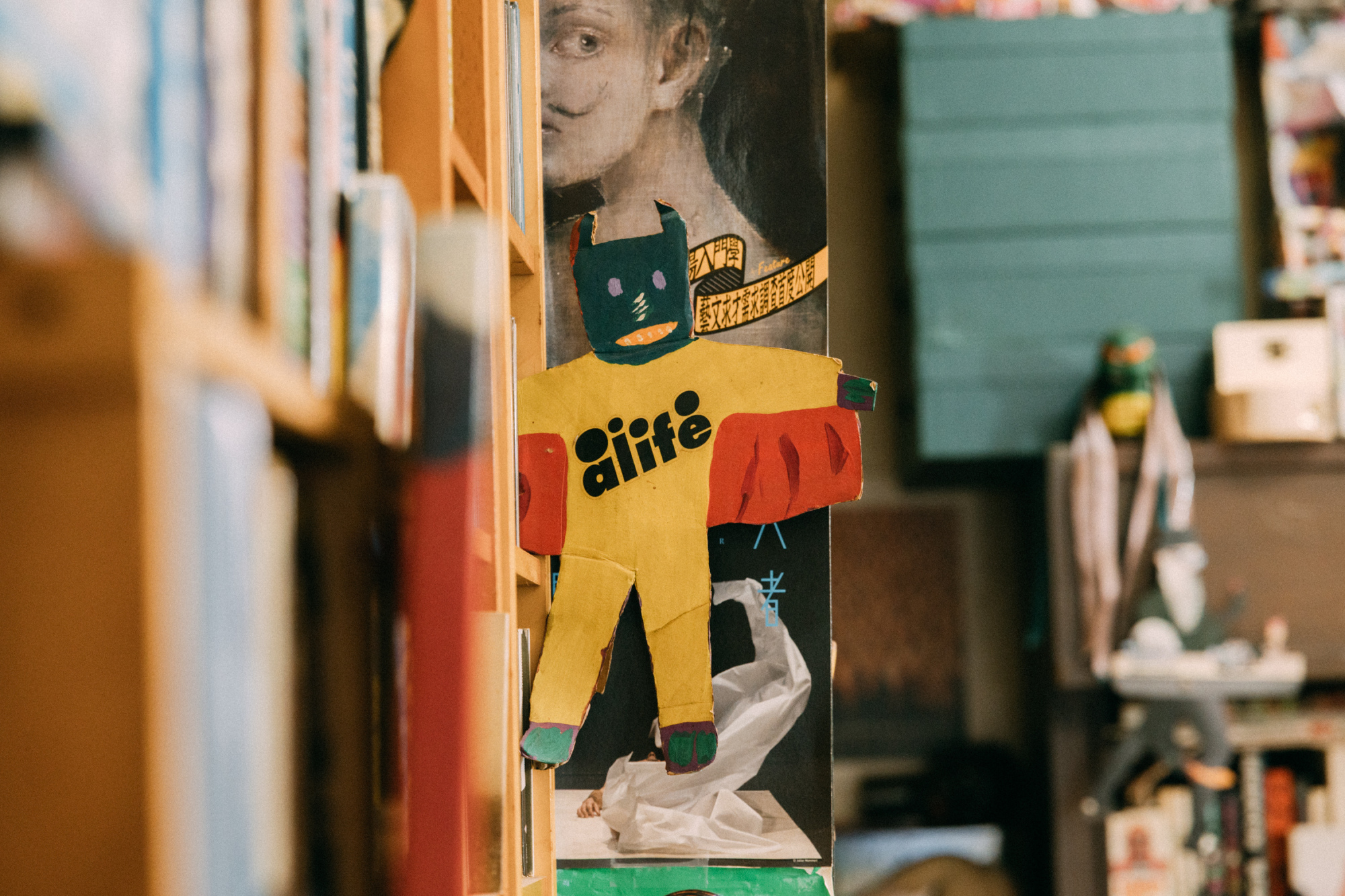 在詹雨樹的工作室,可以看到他利用廢棄紙盒、瓦楞紙製作了多種複合媒材的藝術裝置。尤其許多公仔更有復古與流行元素,儼然是獨一無二的潮玩。