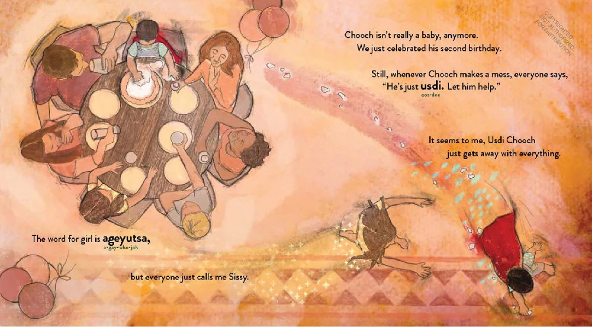 《Chooch Helped》描繪出一個家庭手足間的普世故事,以及他們如何為新生兒騰出空間,繪本故事作者Andrea L. Rogers和插畫家Rebecca Lee Kunz均來自美國東南疏林地區的切羅基族(Cherokee Nation)原住民,Rogers以溫柔的語言描寫手足間的情誼,Kunz則以質樸有力的繪圖,展現出切羅基家庭如何實踐他們的文化傳統。