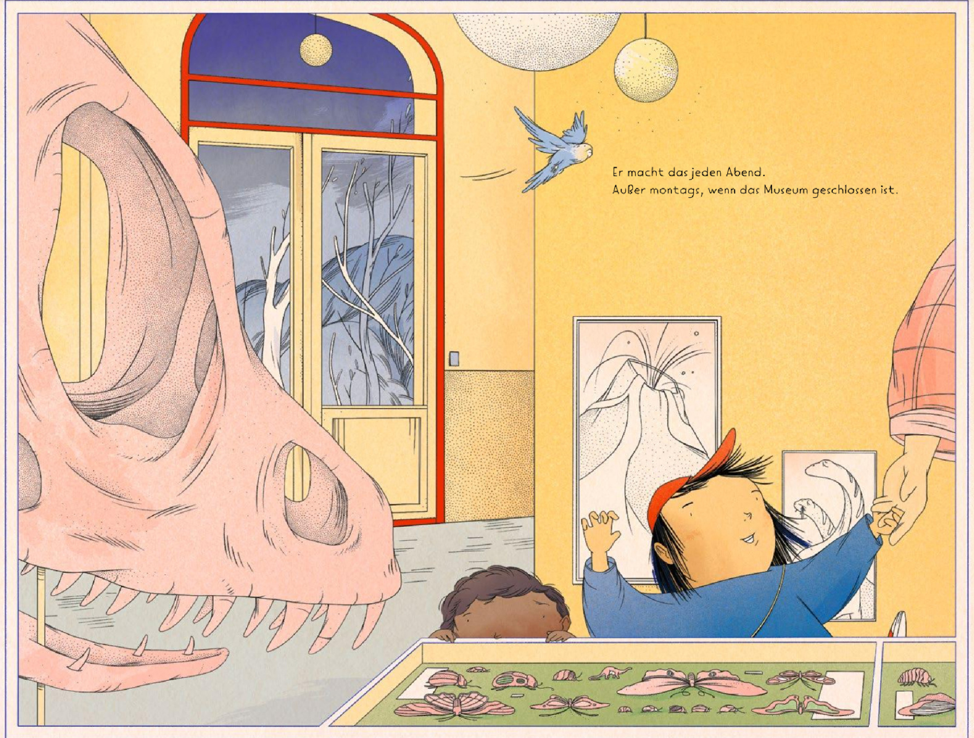 Brückner在快節奏的故事中展示男孩如何在困難的情境下產生創造性和出乎意料的解決方案,她以活潑、新穎的筆法,捕捉博物館內許多複雜而幽默的細節。這本圖畫書受到柏林自然史博物館(Museum für Naturkunde Berlin)教授Johannes Vogel讚賞:「我很興奮,這本書對大自然的想像和視角沒有任何限制!對於有抱負的研究人員來說,館內到處都有令人興奮的大自然,有太多東西等待我們探索。」●