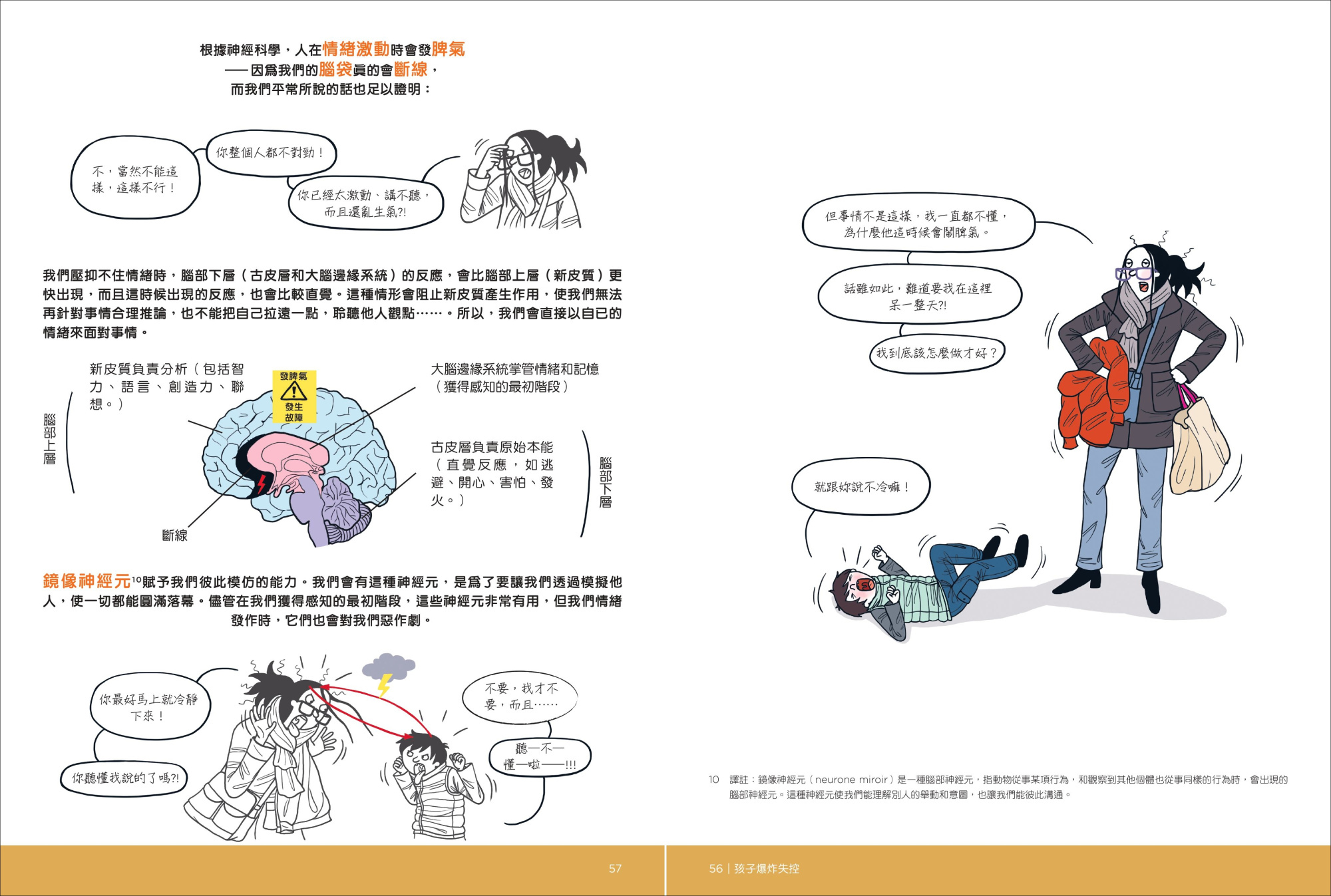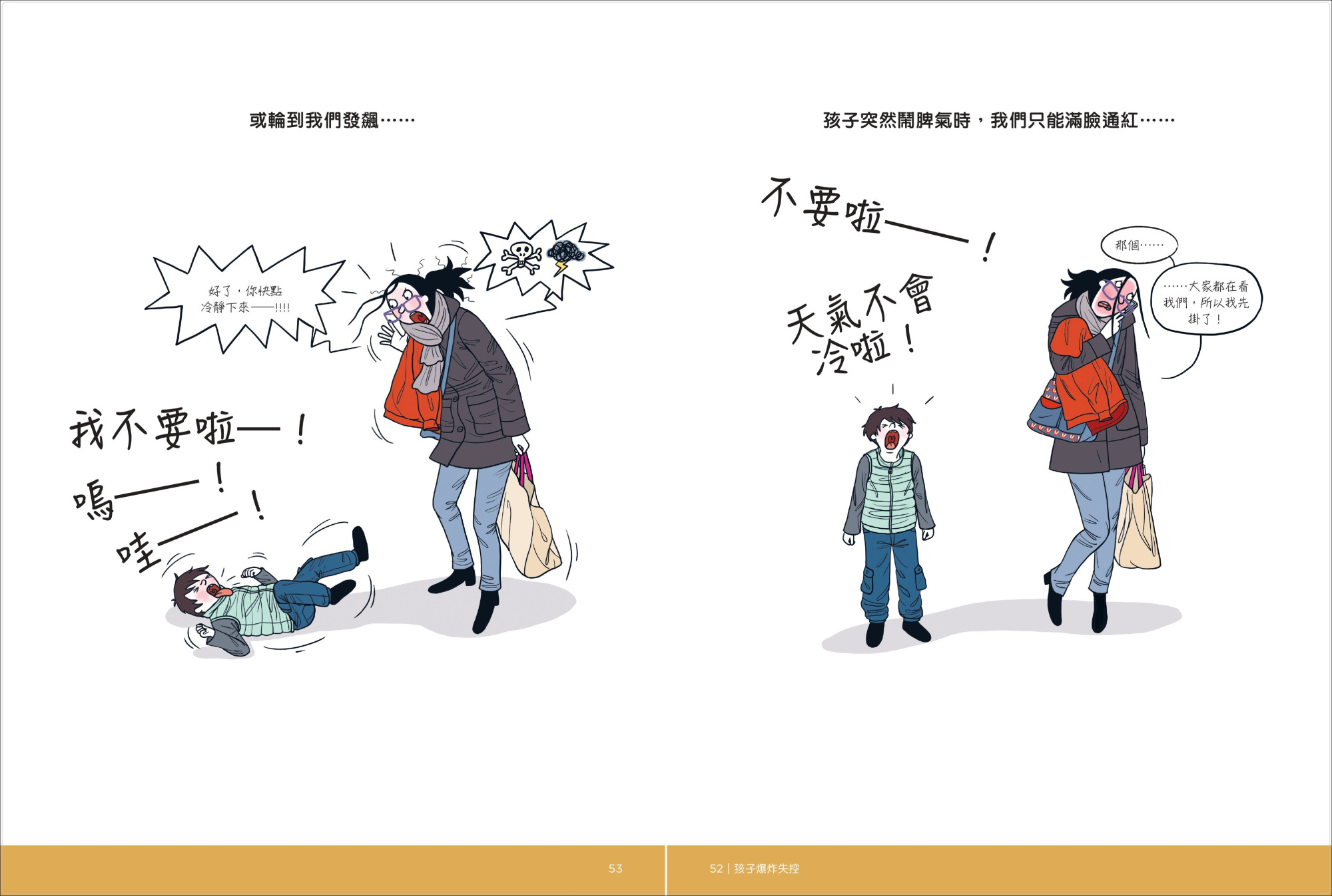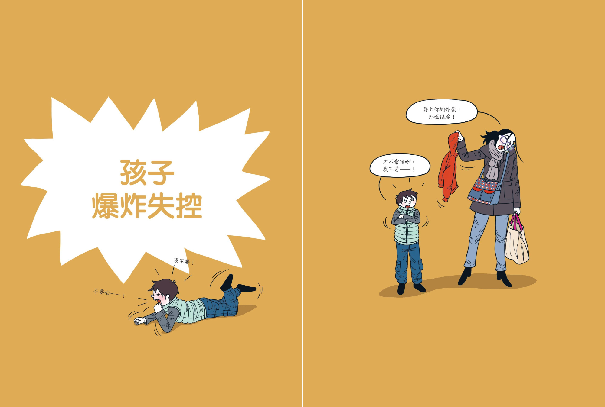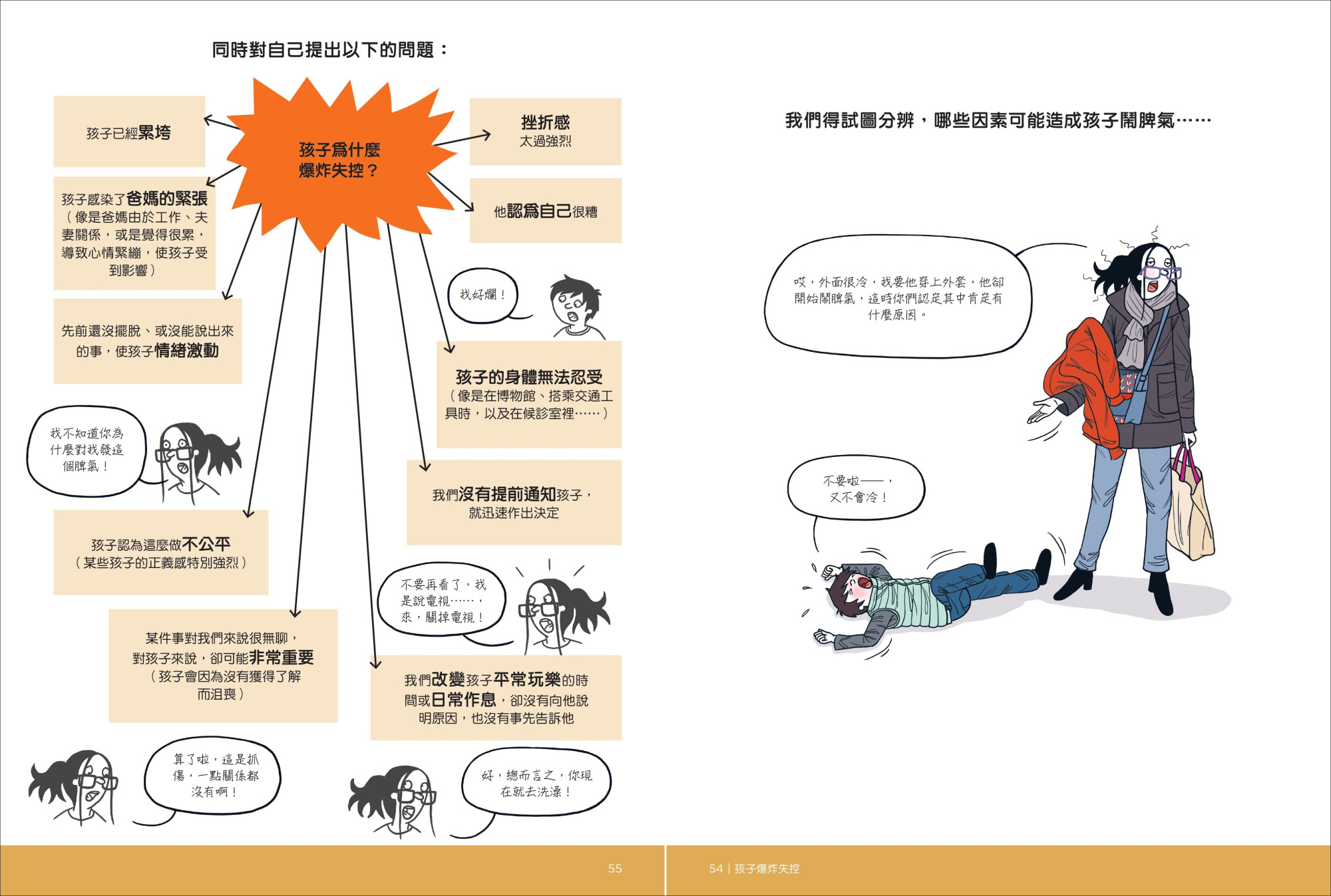 張貝雯:《圖解孩子的失控小劇場》這本書裡,35個情境都先用一張漫畫圖像呈現,讓讀者好像就身在那個衝突的場景中,再用步驟圖、流程圖來拆解這個衝突的原因是什麽,一步一步去分析。