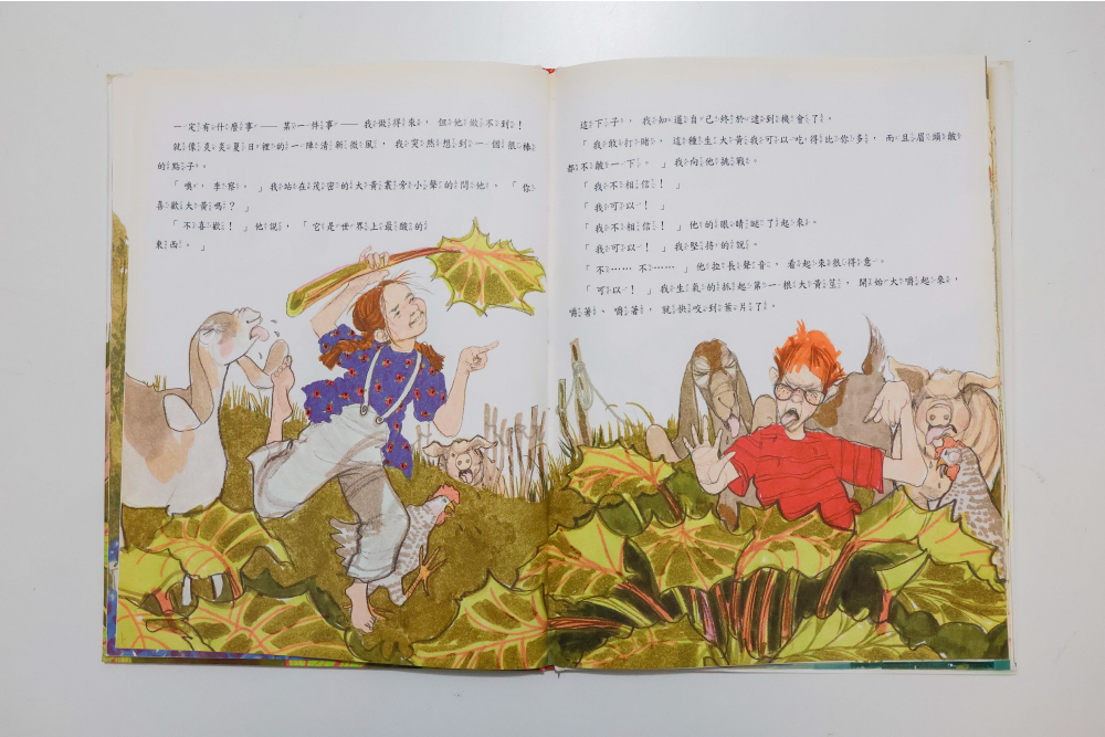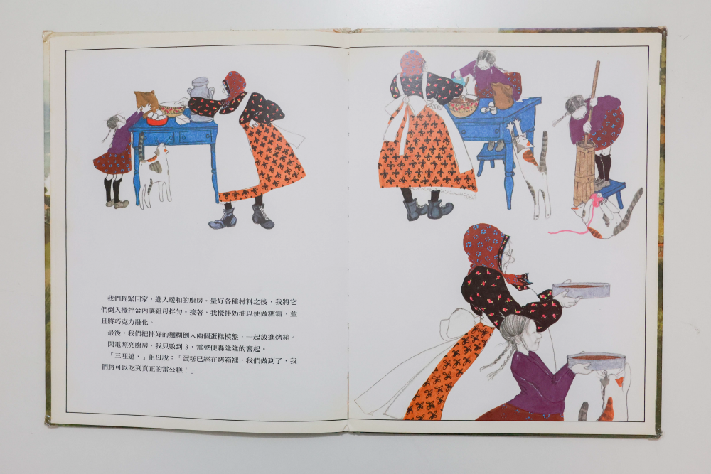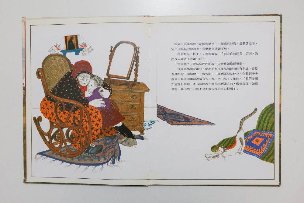 波拉蔻在《雷公糕》裡,以筆觸鮮艷明亮的圖畫,描繪了好多和外婆在農場生活的細節。這本暖心的書,表現了女性獨特的引導方式,溫柔而堅定的外婆以古老的智慧結合烘焙的技術,幫助孫女克服對大雷雨的恐懼。