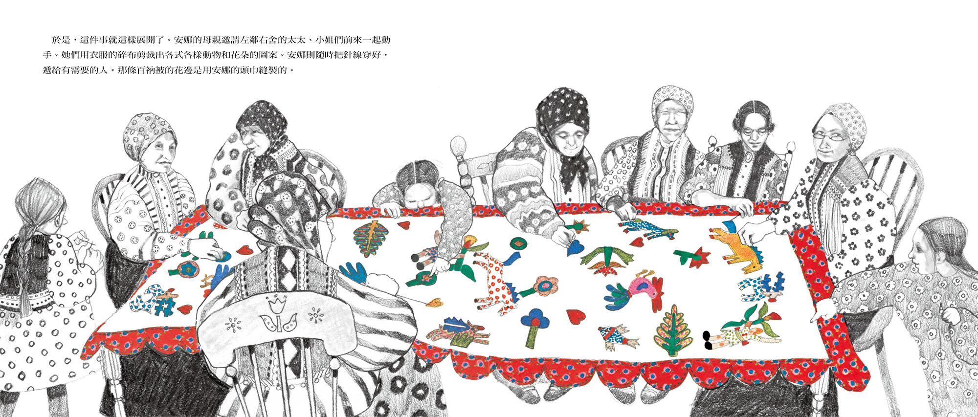 這條出自移民至美國的猶太家族之手的拼布被,是波拉蔻曾曾祖母來到美國之初,用家鄉帶來的舊衣服為女兒縫製的棉被,後來又陸續增添了來自家族成員的材料,他們要用這條合力縫製的被子,永遠記得故鄉。無論生老病死還是喜樂憂傷的時刻,這條見證家族重大事件的被子,都會一代一代的傳承下去。