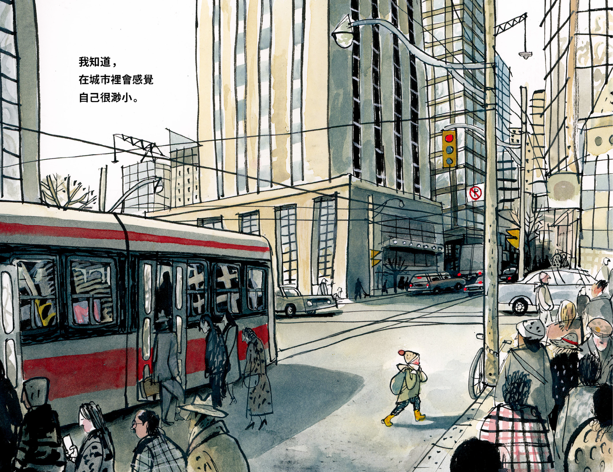 2019年出版的《城市裡的小訪客》,是史密斯自寫自畫的第一部作品,除了小男孩和貓,「城市」不只是上演這個故事的舞台,它也是角色之一。