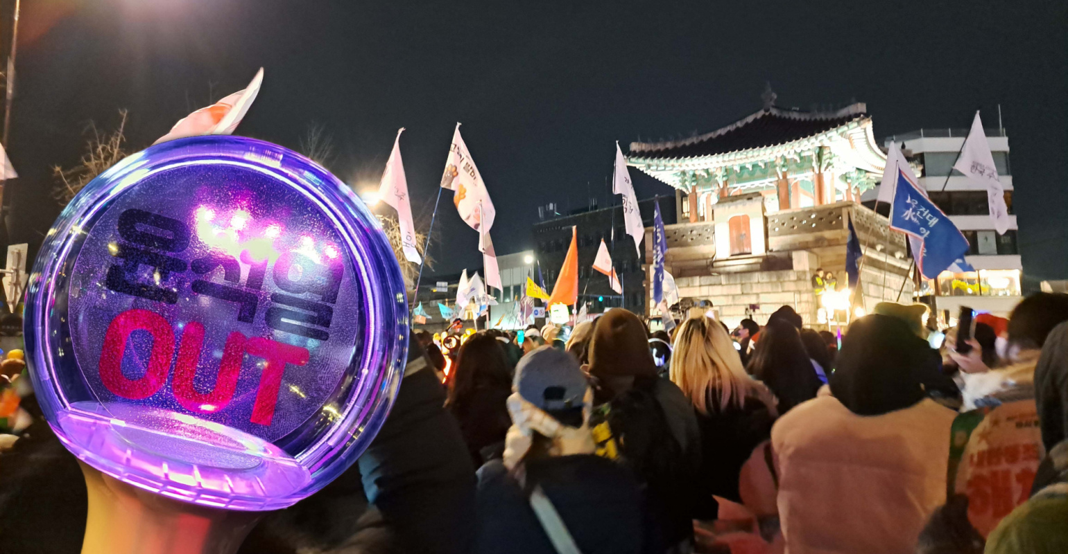 口號、KPOP音樂未曾停歇,手板和手燈始終高舉。這一天距離「戒嚴結束」已有20天,但國會通過尹錫悅彈劾案令其停職才不過10天。在等待憲法法庭審理前,群眾只能不斷高聲要求:彈劾尹錫悅!