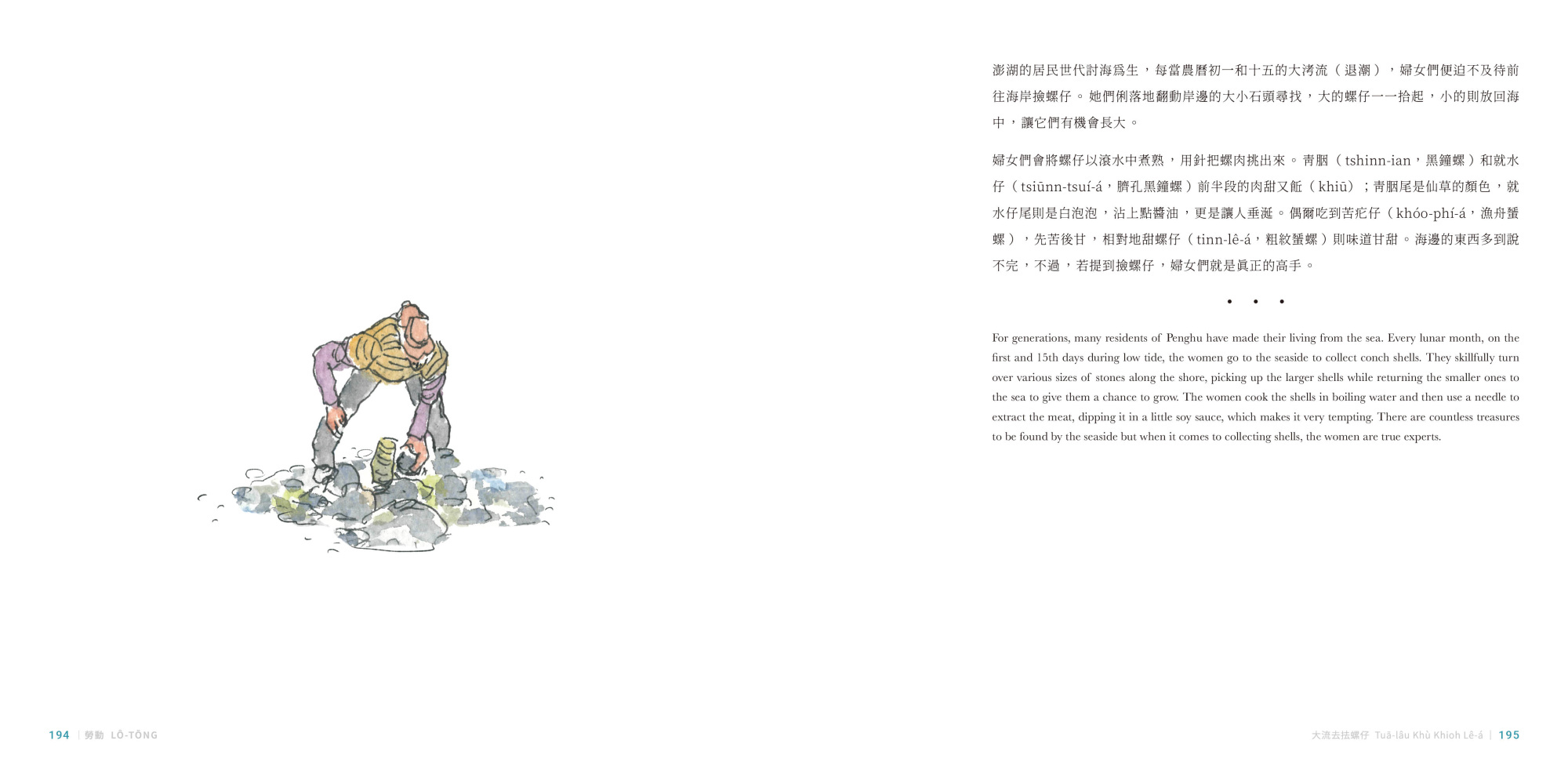 他舉例,書中提到澎湖婦女常在海邊撿螺仔,呂老師還生動形容4種螺肉的吃法與風味,卻不太確定它們的學名。「其中一種螺,呂老師原本寫作『醬錐仔』,讀音為tsiùnn-tsuī-á,我翻查各種文獻、中研院貝類資料庫、魚貝類收藏家的網站、圖鑑等,經交叉比對,發現這種螺類在農業部的資料庫被記為『就水仔』。」最終,陳亮均拿圖鑑請呂老師確認,才拍板中文名為「臍孔黑鐘螺」。