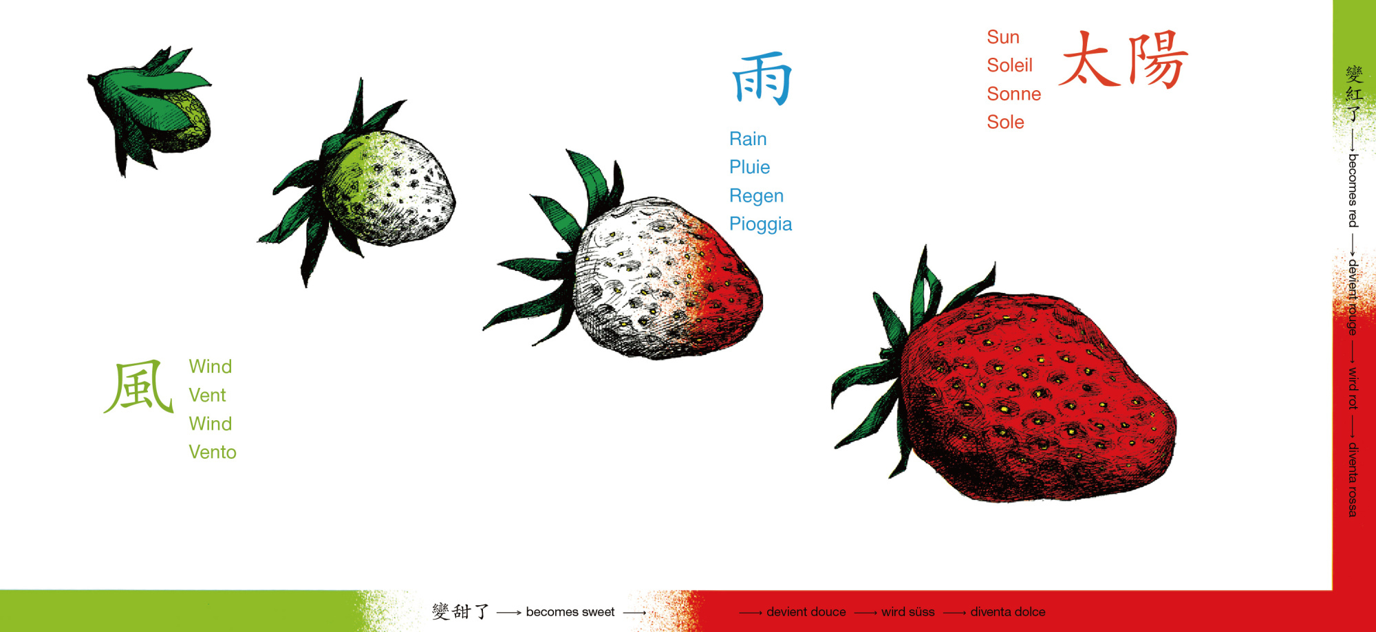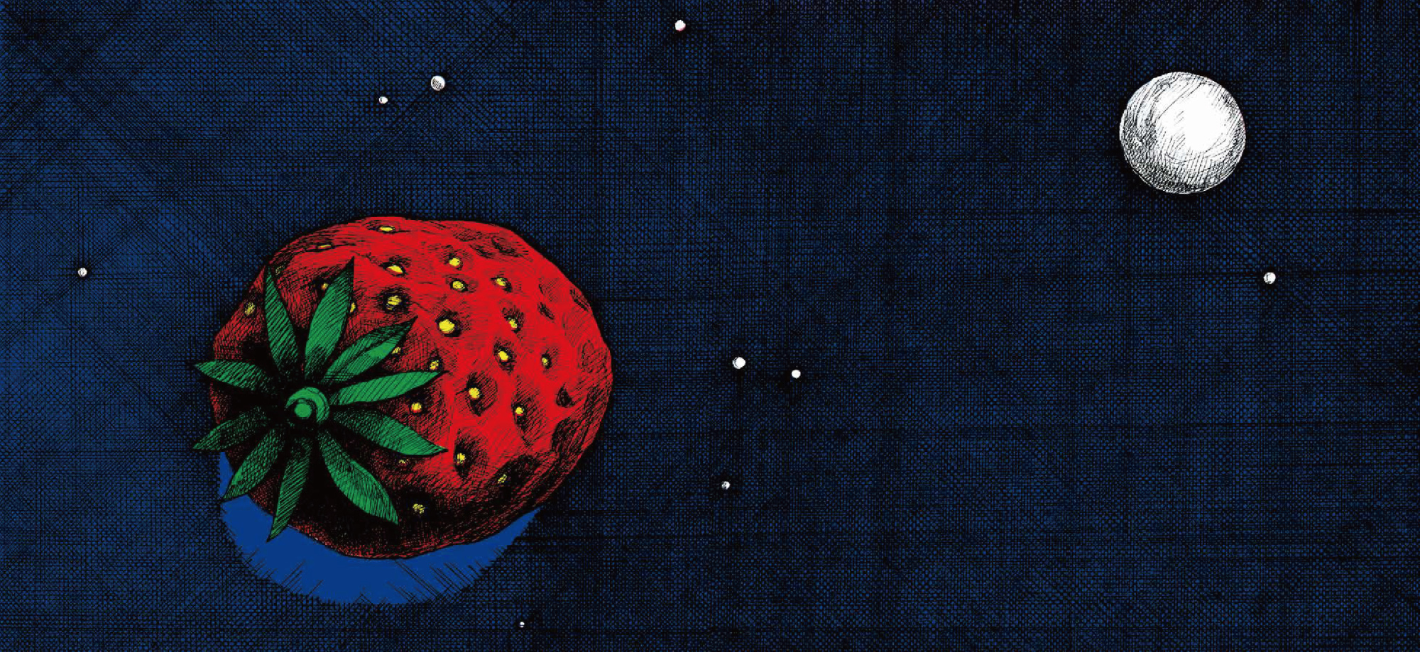 1975年出版的《草莓》,是新宮晉的第一本繪本創作,長銷50年,至今看來仍鮮美芬芳。這本書用簡潔詩意的文字和生動的圖畫,描繪了草莓的生長歷程。一顆來自偉大自然的小小草莓,卻蘊含了甘甜、美麗及嚴苛的生命訊息。隨著翻頁,視角不斷變化,由草莓的內部連結到浩瀚的宇宙,草莓的無限風景徹底改變了我們看待事物的方式。