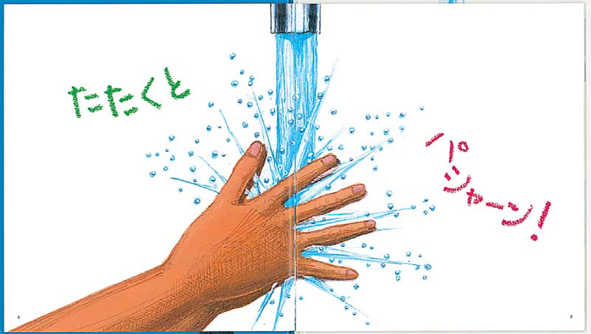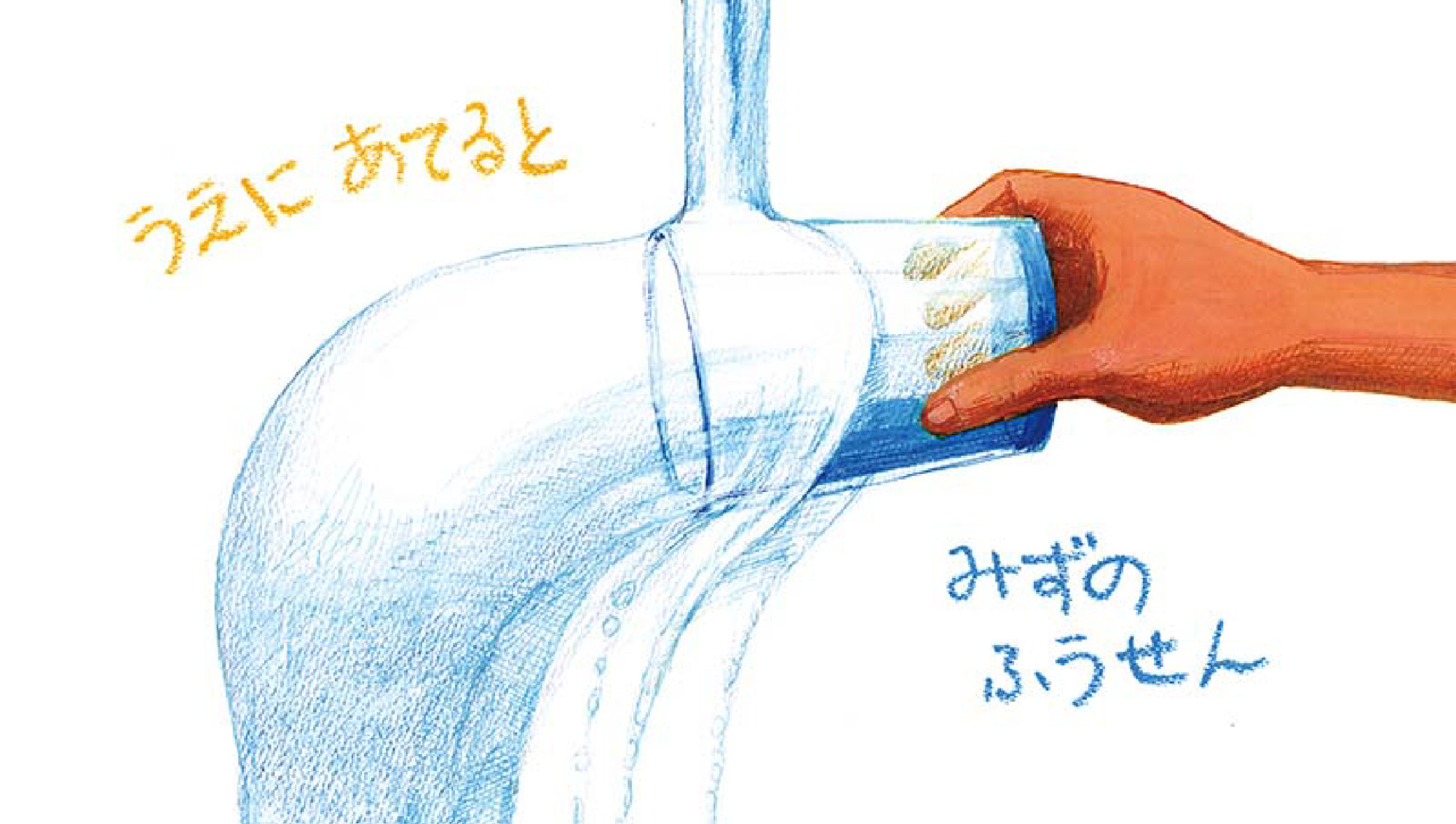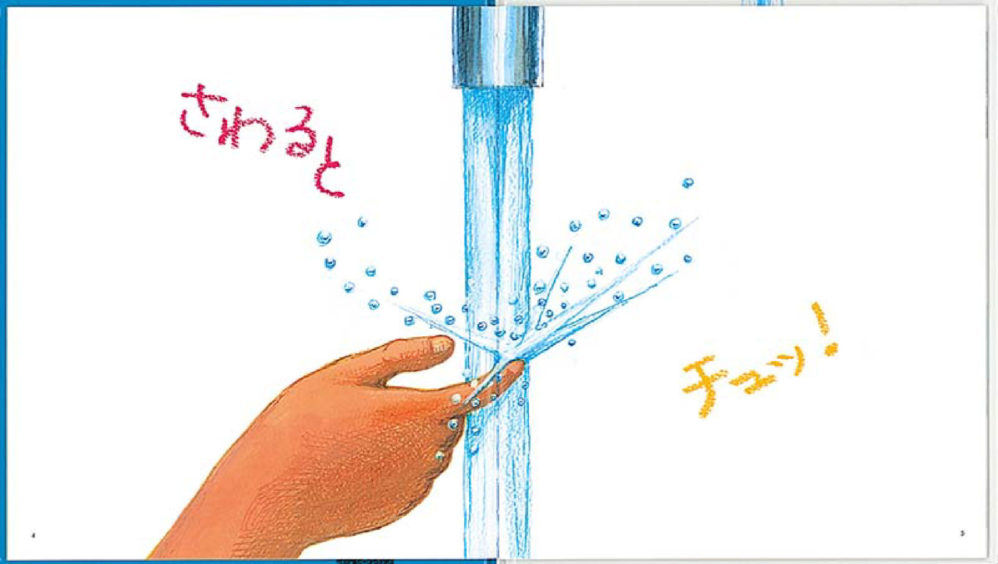 《じゃぐちを あけると》(暫譯:當你打開水龍頭)發表於福音館2004年4月號的「小小科學之友」,並於2009年出版單行本。書裡每一頁,水都從畫面正中央的水龍頭流出來,似乎觸手可以拍打它,水的形狀因各種工具也隨之千變萬化。對水的奇妙深深著迷的新宮晉,持續創作著隨水和風而動的雕塑作品,這是他特別為愛玩水的孩子們準備的繪本。