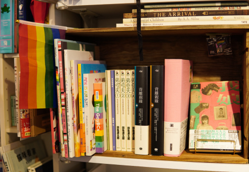 有光的所在,也是兩人合力打造的所在。書店裡有滿滿一排與兒童、性別有關的書籍,以及鍾欣穎四處搜集來的各國繪本。再往店內走,則是整櫃國際議題、歷史和台灣主題的著作。選書風格正反映了兩人各自的專業領域。