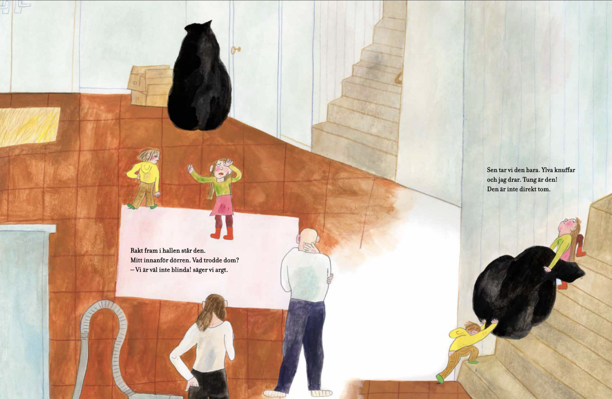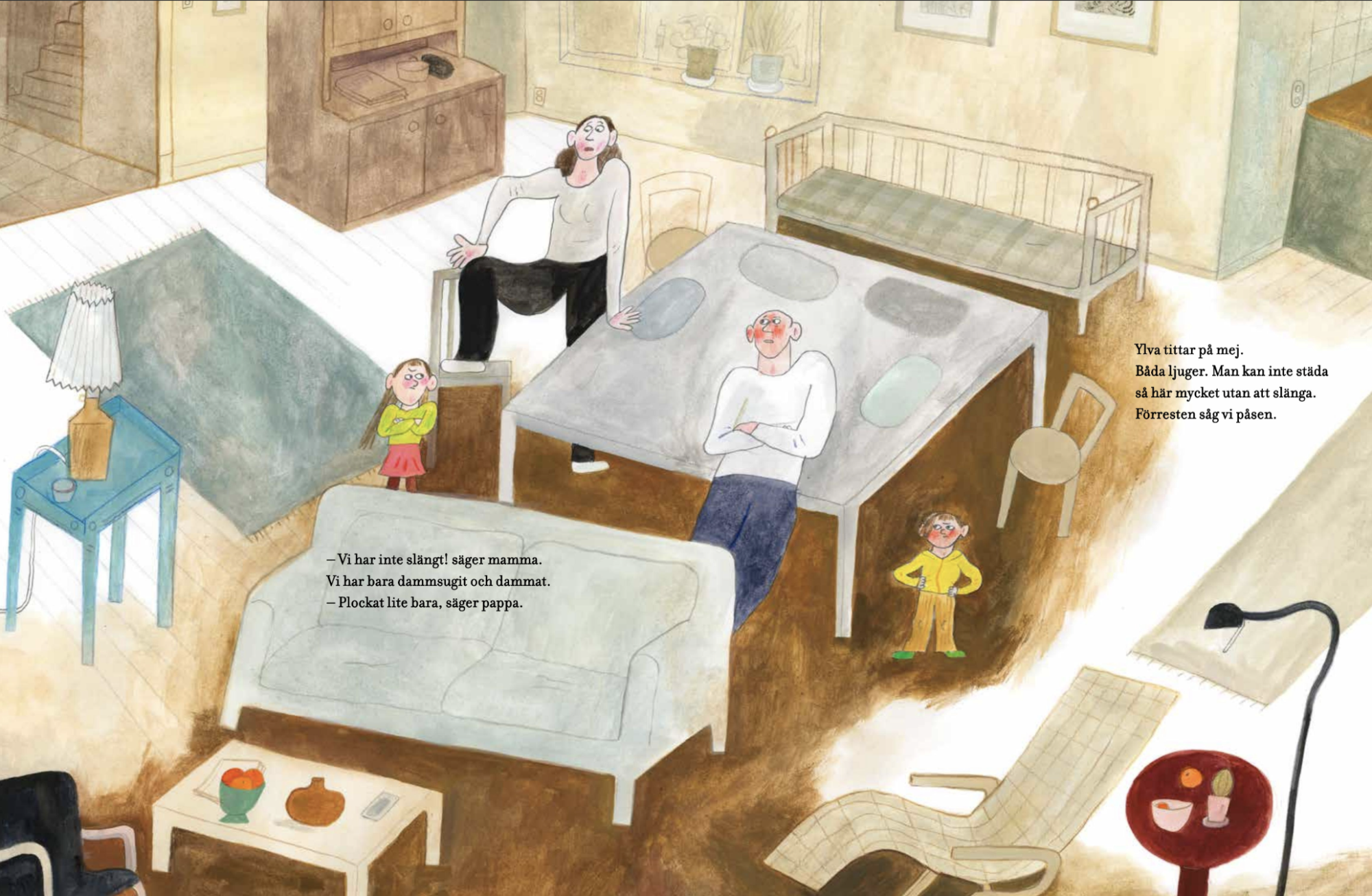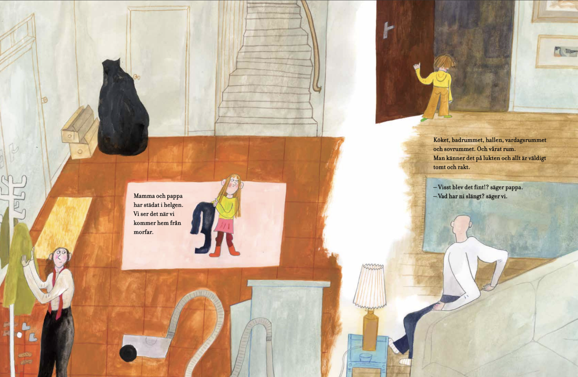 故事中的爸媽趁孩子們不在時打掃了整個家,從廚房、浴室、客廳,到孩子們的房間,全都一塵不染。孩子們回家後,立刻注意到了這個黑色的大袋子,它太空了,太直挺挺了,而且它聞起來……很乾淨。父母聲稱他們只是撣了撣灰塵,撿了撿東西,但走廊上卻有一個黑色的大袋子,裡面裝滿了各種「不重要」和「破損」的東西。