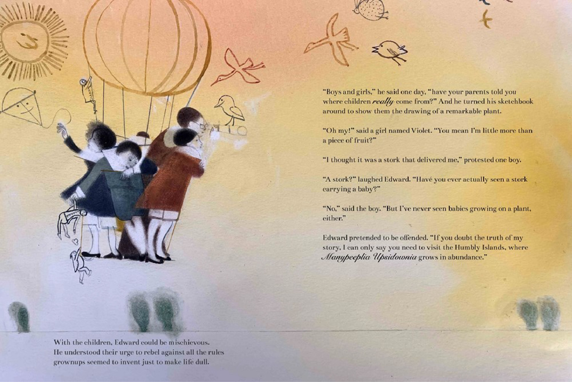 這本長篇傳記繪本是寫給英國荒誕詩歌創始人、與奧杜邦齊名的自然史插畫家愛德華・里爾(Edward Lear,1812-1888)的動人情書,由美國兒童文學作家沃爾弗頓・希爾(Wolverton Hill)執筆,英國繪本作家羅拉・卡爾琳(Laura Carlin)繪圖,她的繪畫捕捉了愛德華・里爾的俏皮感,並運用色彩的差異來反映主人公遊走於不同世界的細膩感受,同時巧妙的融入了里爾自己畫的插圖。繪本生動展現出作家與藝術家愛德華・里爾燦爛豐富的一生,頌揚了遊戲、詩歌、故事,以及荒誕無稽的幽默感。本書最令人著迷的地方,是在事實與虛構之間穿插著異想天開的情節,更是一本妙趣橫生的繪本。